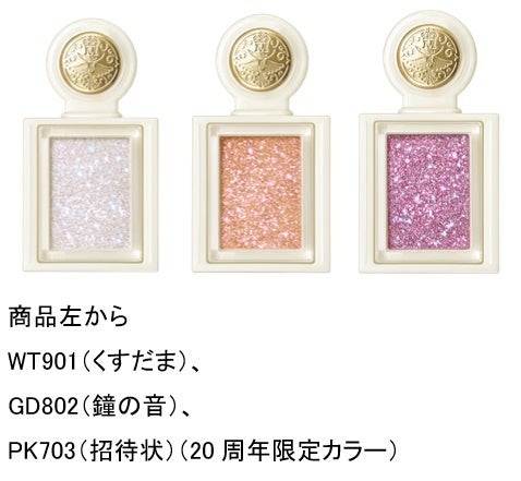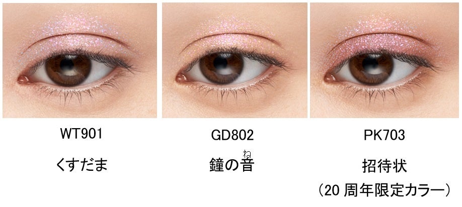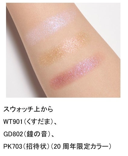 色調は、ホワイトベースにピンクやブルーなど様々なカラーに輝くWT901(くすだま)、ゴールドベースにレッド~テラコッタに輝くGD802(鐘の音)、くすみピンクベースにピンク~パープルのラメが輝く20周年限定カラーPK703(招待状)です。
