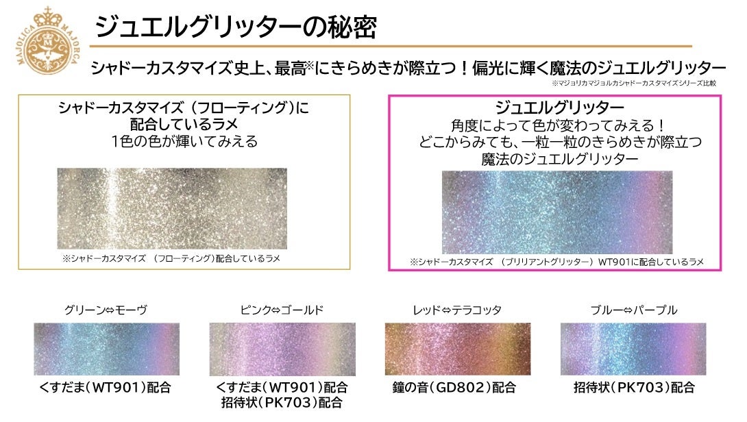 20周年の幕開けとなる第1弾は、単色アイシャドウ「シャドーカスタマイズ」の新シリ-ズ「シャドーカスタマイズ (ブリリアントグリッター)」【全3品、希望小売価格 1,100円(税込1,210円)】を2023年7月21日(金)より発売します。※マジョリカ マジョルカ シャドーカスタマイズシリーズ比較
