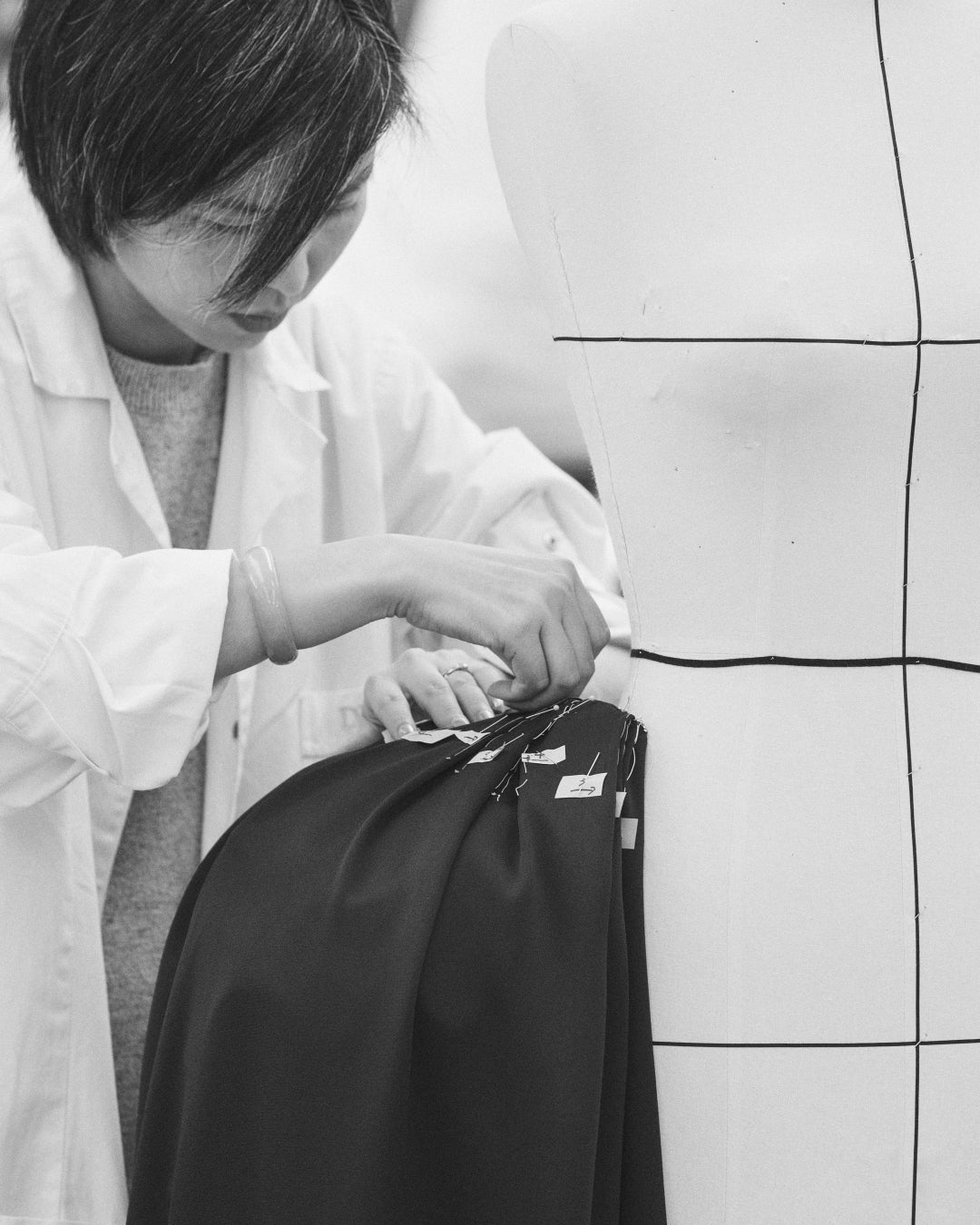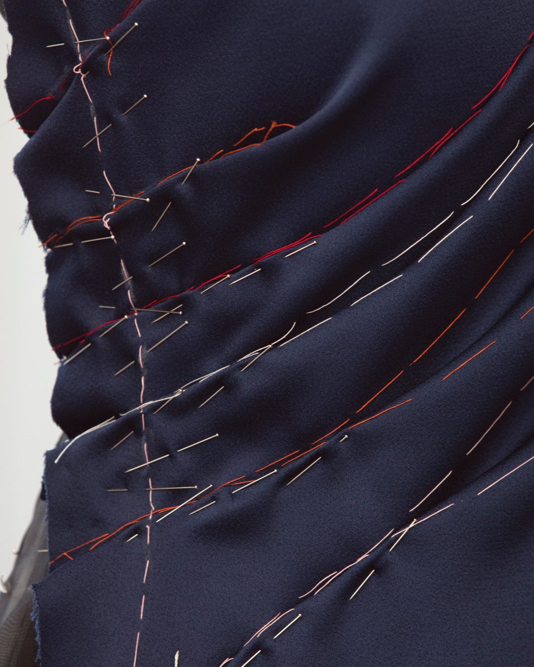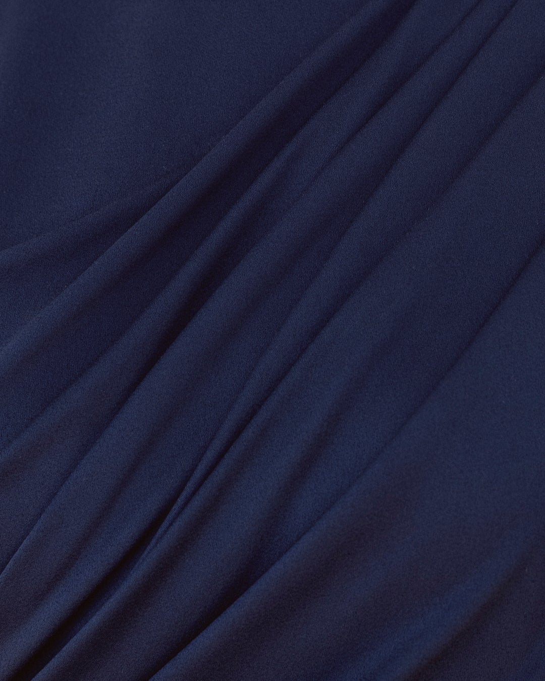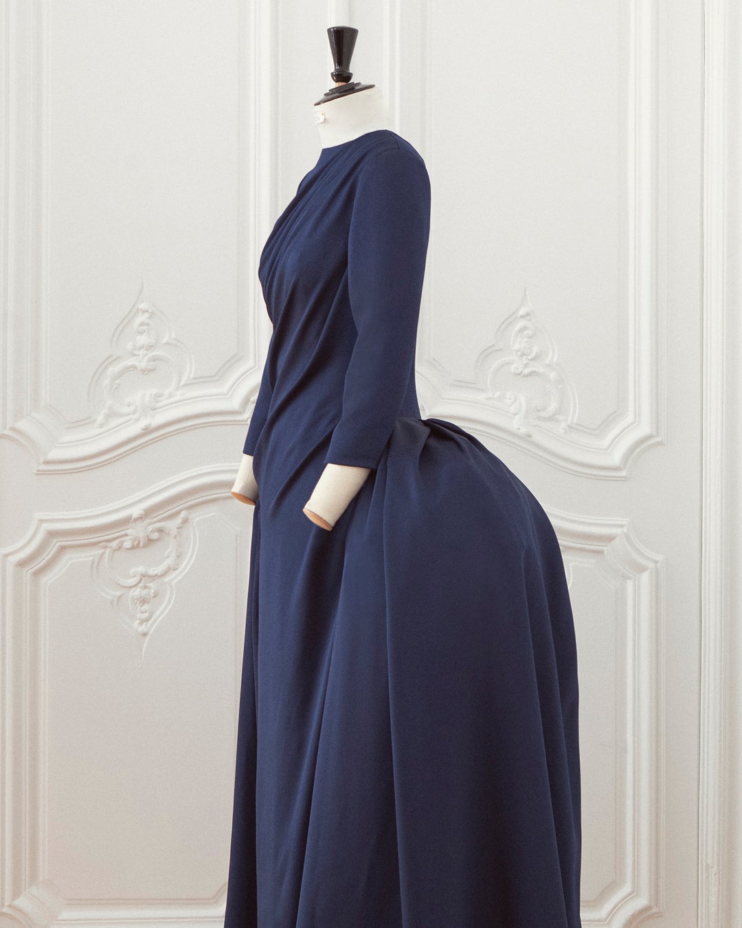 アルバ・ロルヴァケルが纏った、ドレープとプリーツ加工を施したネイビーブルーのシルク クレープドレスは、126時間をかけて完成に導かれました。