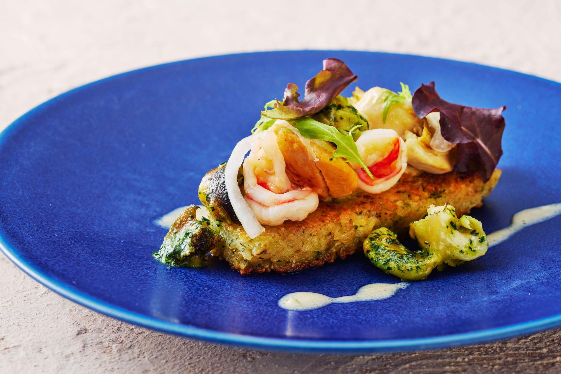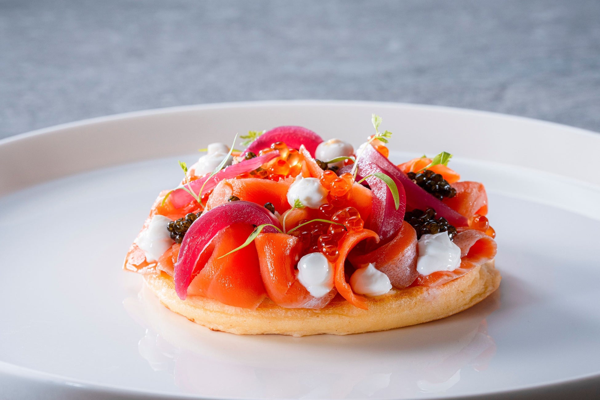 北海道産じゃがいもを使ったしっとりパンケーキに、濃厚な旨味の自家製スモークサーモンと爽やかな酸味のサワークリームを合わせました。キャビアの豊かな風味と調和する、色どりも美しいシェフこだわりの一皿です。