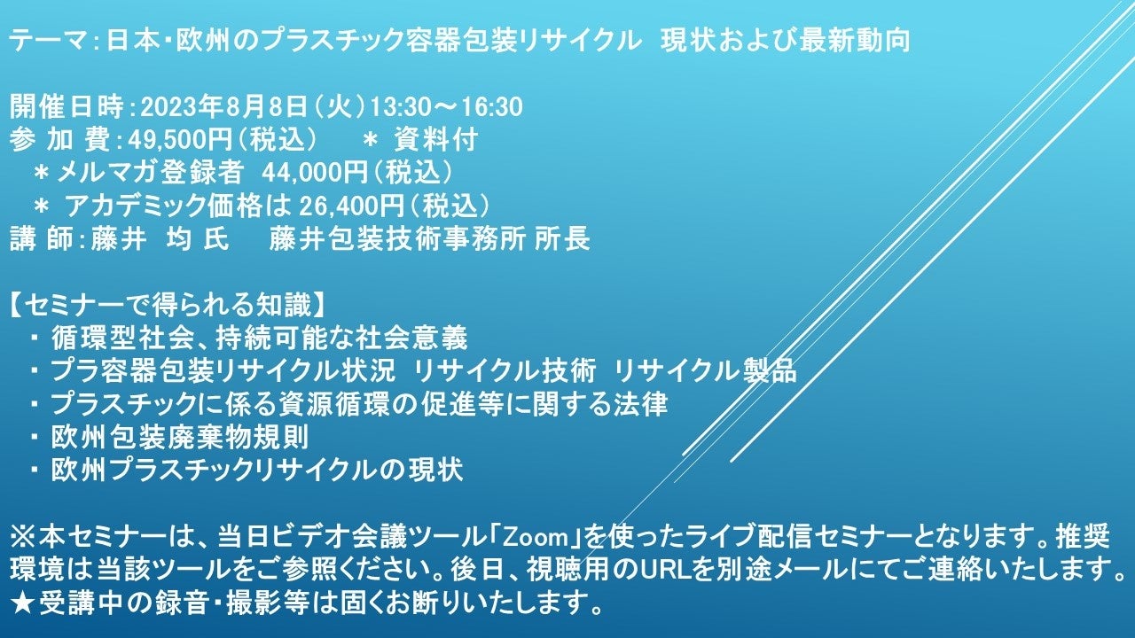 【ライブ配信セミナー】日本・欧州のプラスチック容器包装リサイクル 現状および最新動向 8月8日(火)開催 主催:(株)シーエムシー・リサーチ