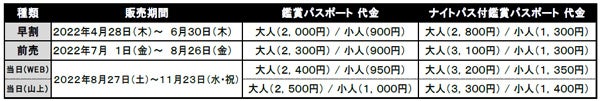 ※ナイトパス付鑑賞パスポートは有料会場への入場と、夜間作品を期間限定で公開する「ひかりの森~夜の芸術散歩~」会場への入場がセットになったパスポートです。「ひかりの森~夜の芸術散歩~」は9月23日(金・祝)~11月23日(水・祝)の土日祝、17:00~20:00の限定開催となります。ご鑑賞にはナイトパス付鑑賞パスポートまたはナイトパス(大人1,600円 / 小人800円)が必要です。