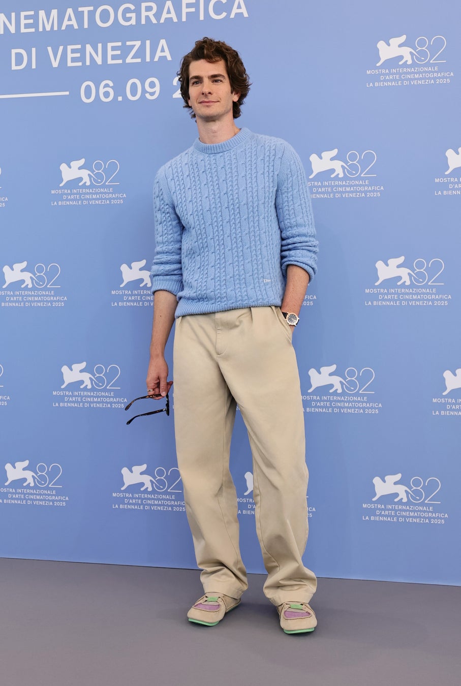 アンドリュー・ガーフィールドは、ライトブルーのウールニットに、ベージュコットンパンツと、ベージュ、パープル、グリーンをあしらったレザーの「Roadie」スニーカーを着用しました。