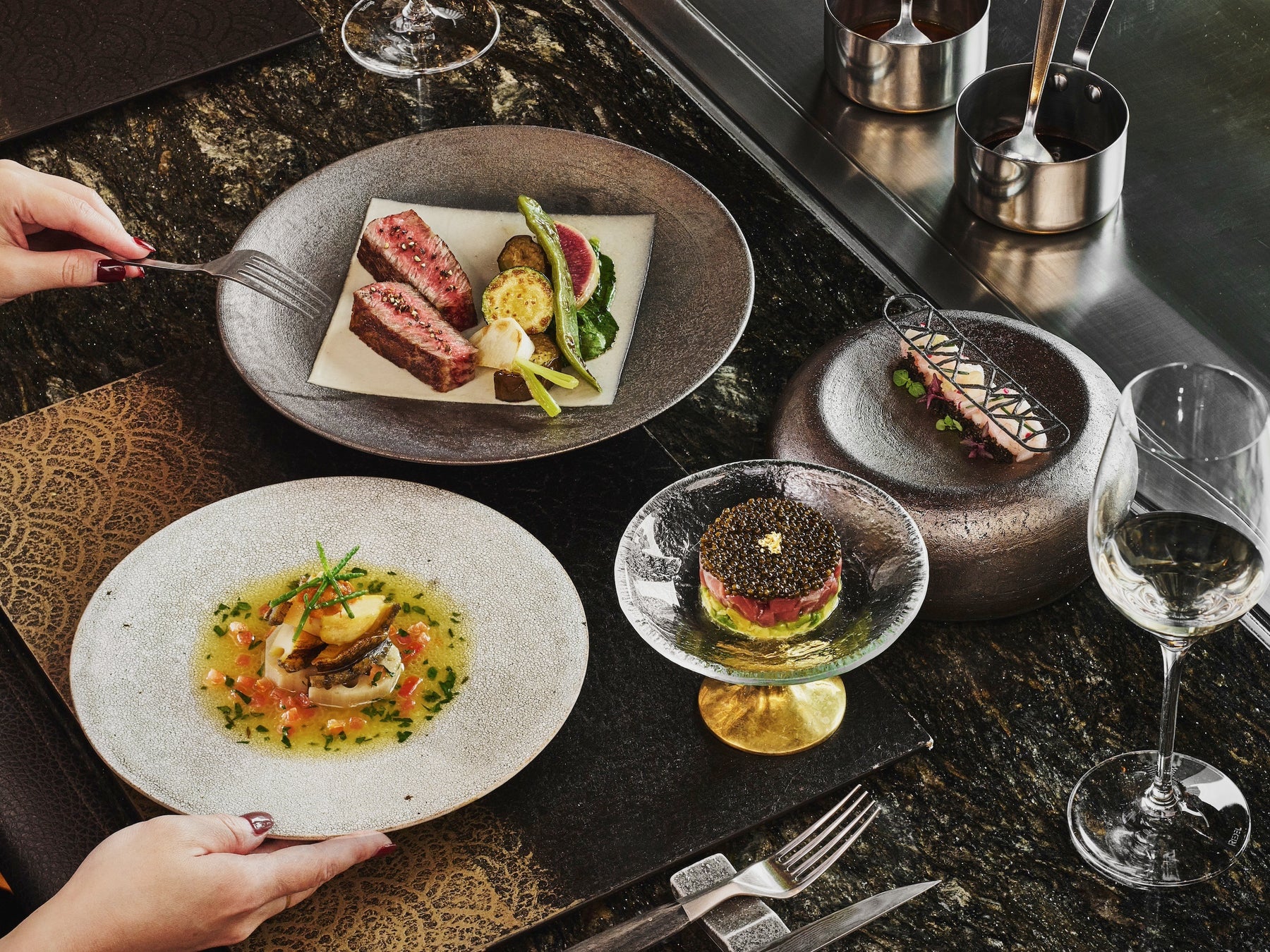 静かな高揚と密やかな一体感が満ちる、和城のカウンター。ダイヤモンドの輝きに着想を得たコースでは、黒いダイヤモンドと称されるキャビアをあしらった「キャビア 鮪 アボカドのアンサンブル」が、深みのある旨味とともに静謐な存在感を放ちます。「甘海老のタルタル 炭のアクセント」は、砕いた炭の繊細なニュアンスが、甘海老のまろやかさに輪郭を添え、海の恵みが上品に際立つ一皿。黒トリュフや鮑、季節の果実が織りなす調和は、和と洋の感性が響き合い、優雅な物語のようなひとときを紡ぎます。目の前で丹念に仕上げられる一皿一皿が、五感と心を深く満たす、優美な歓びのひとときをお過ごしください。