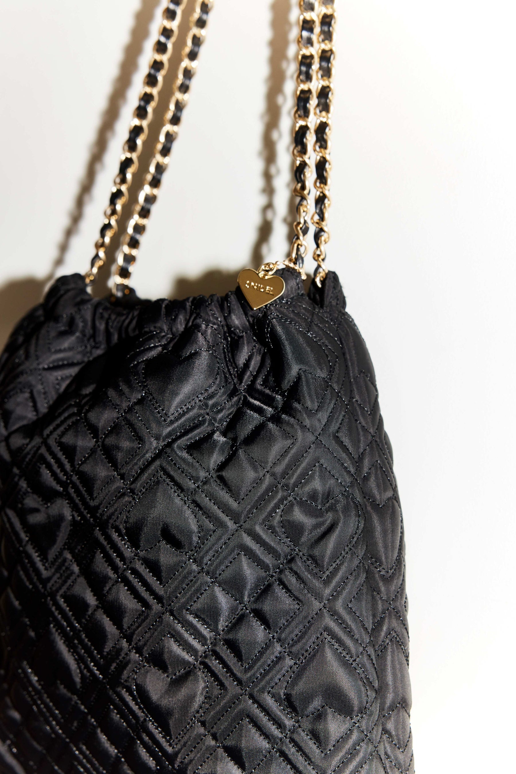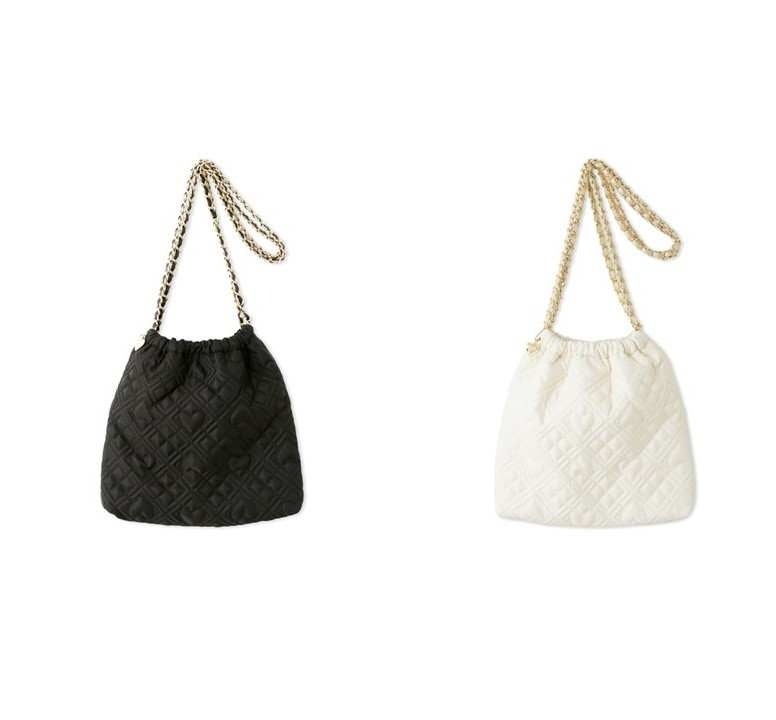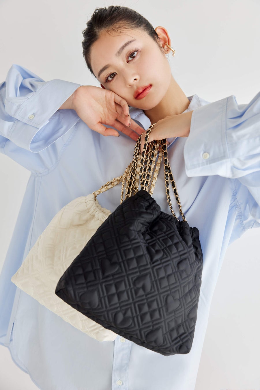 人気のチェーンショルダーに、愛らしいハートのキルティングを施した巾着バッグ。