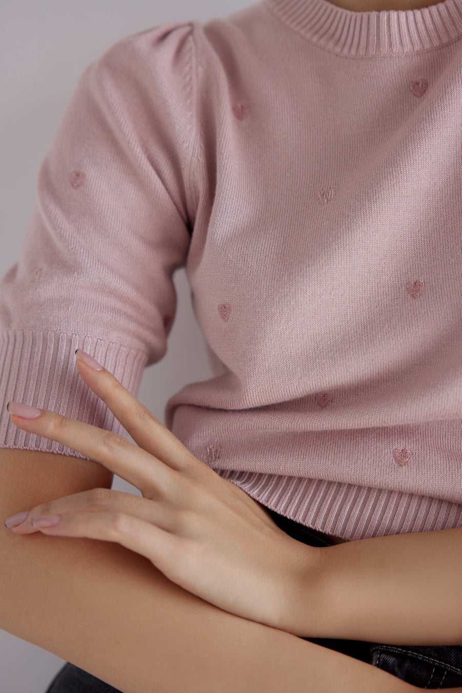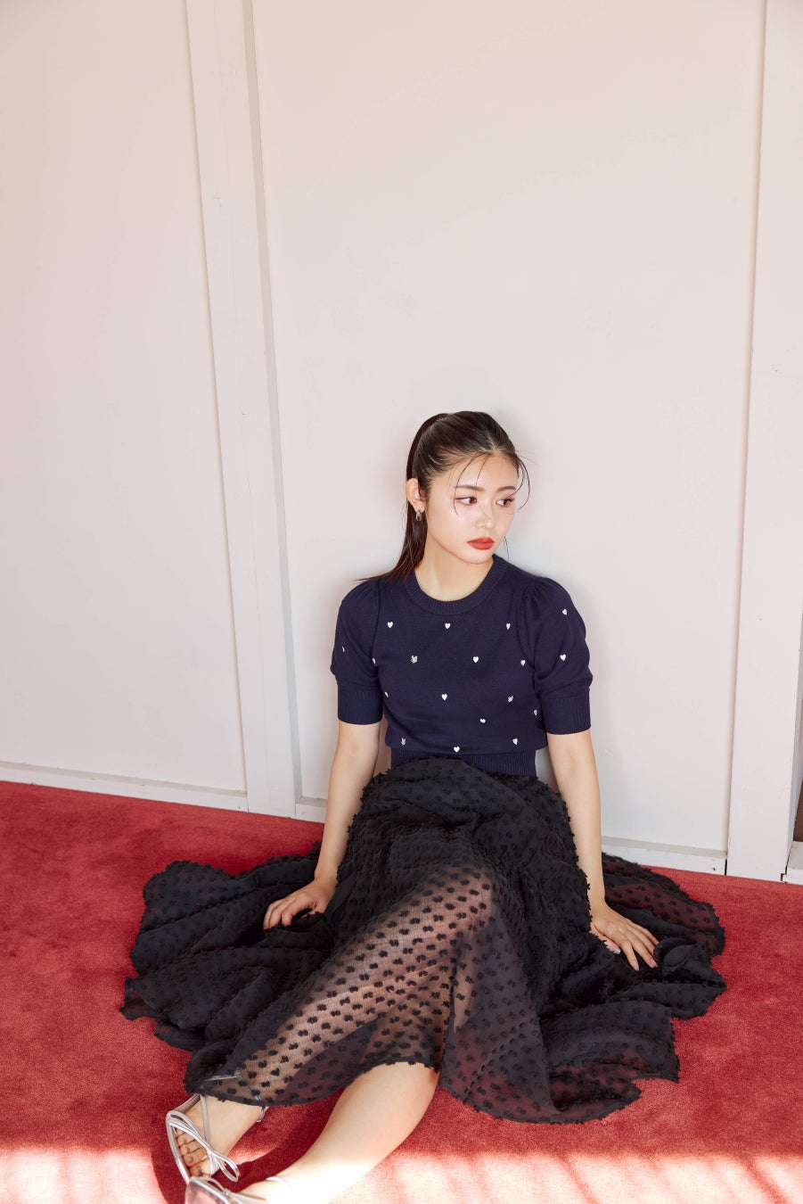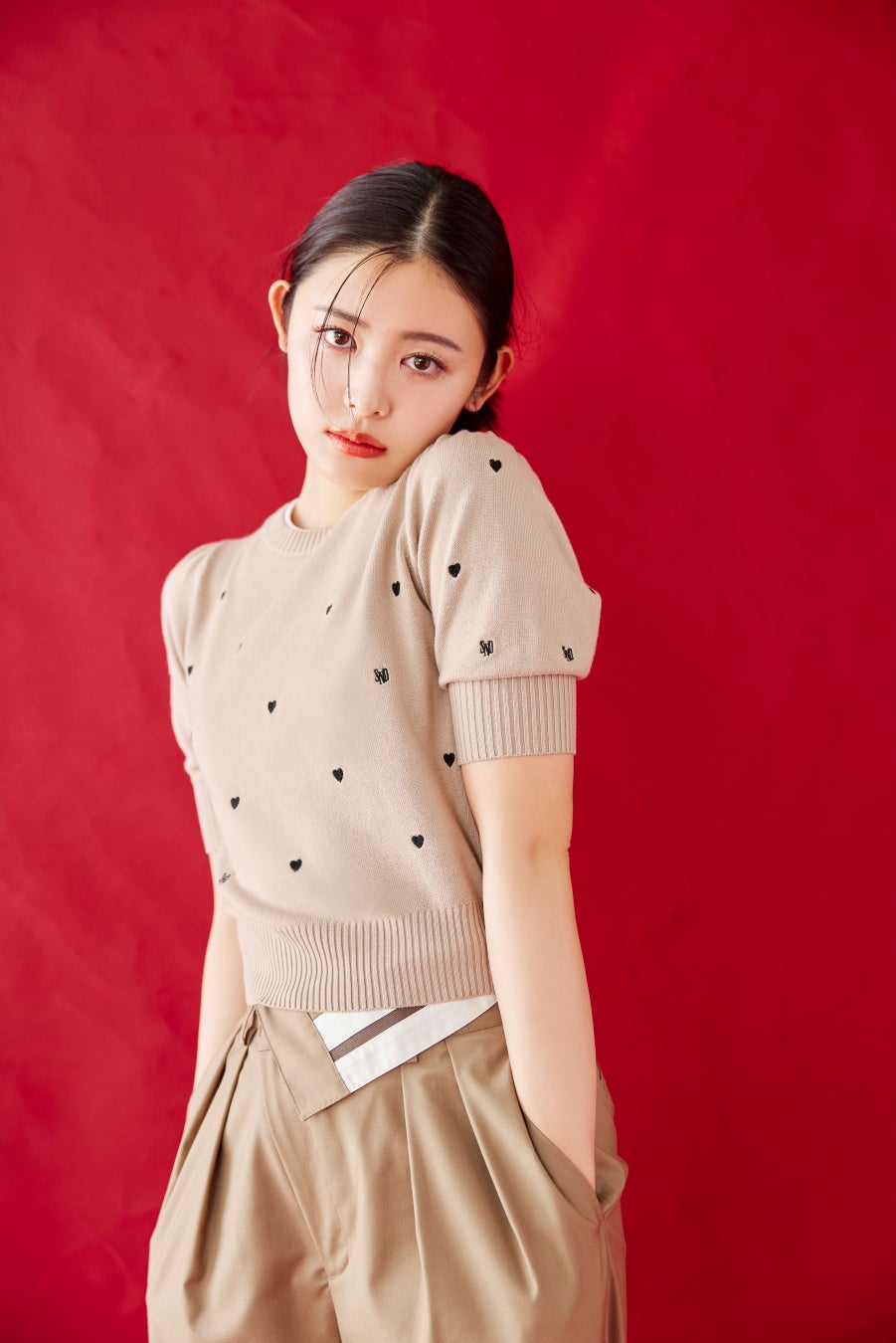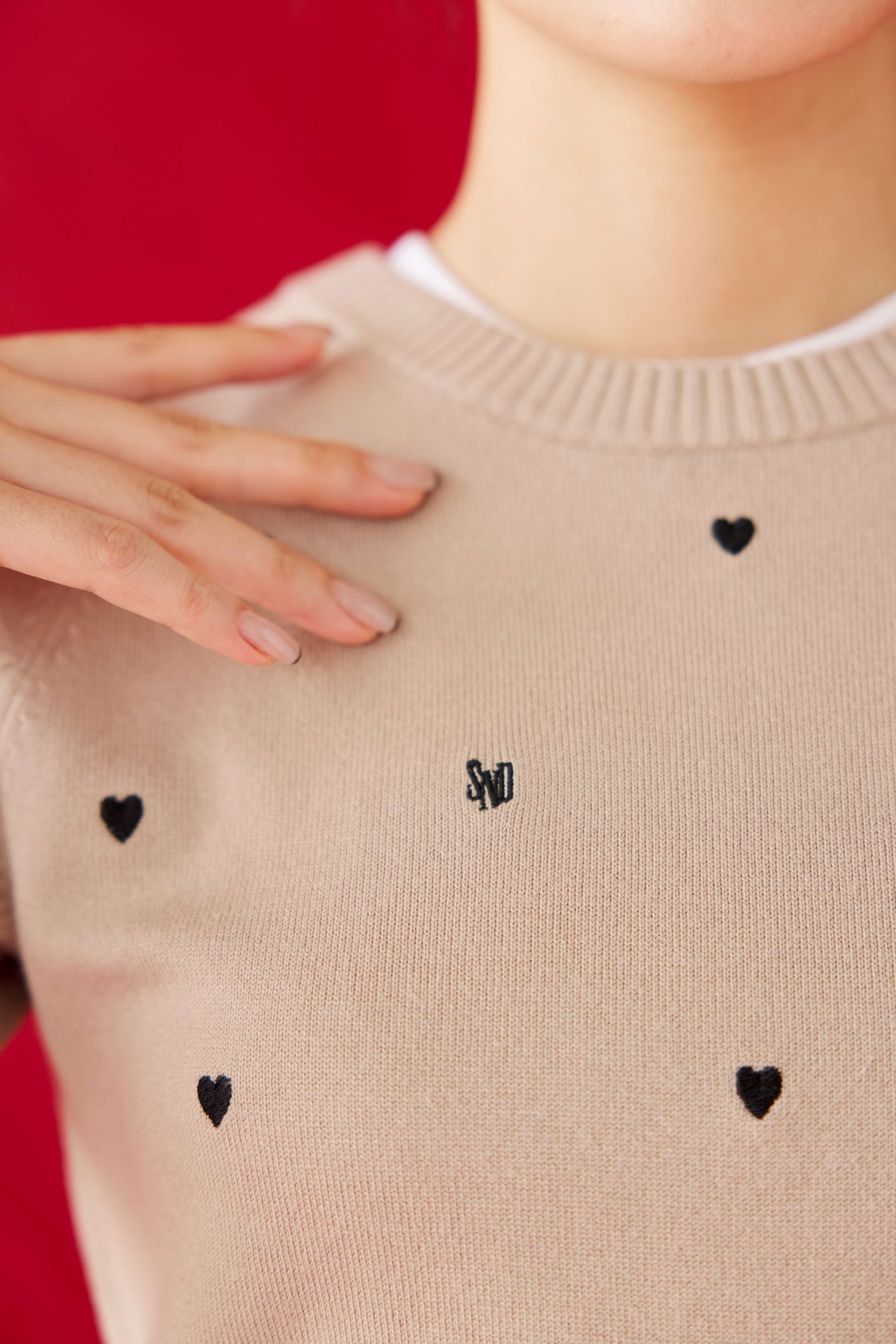 程よい甘さのハートモチーフ刺繍のニットプルオーバー。