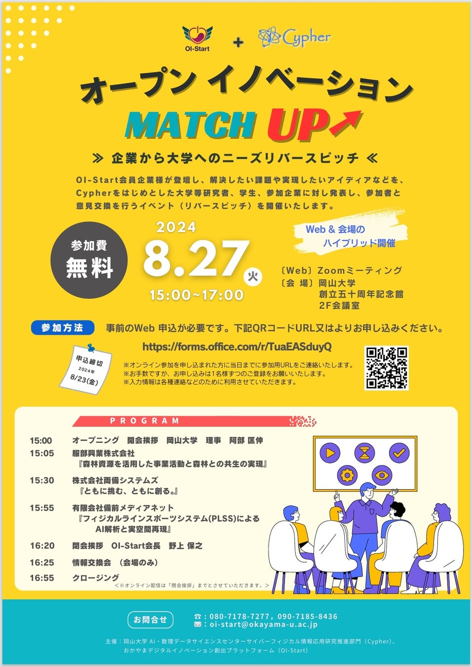 国立大学法人岡山大学(本部:岡山市北区、学長:那須保友)では、「おかやまデジタルイノベーション創出プラットフォーム」(OI-start)会員が登壇し、解決したい課題や実現したいアイディアなどを、岡山大学AI・数理データサイエンスセンターサイバーフィジカル情報応用研究推進部門(Cypher)をはじめとした大学等研究者、学生 、参加企業に対し発表し、参加者と意見交換を行うイベント(リバースピッチ)を、2024年8月27日(火)15:00~17:00にハイブリッドで開催いたします。