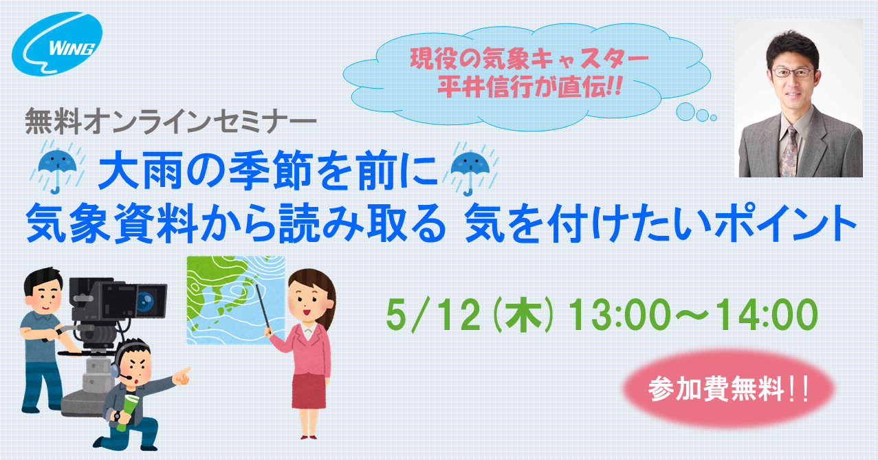 株式会社クリーク・アンド・リバー社(C&R社)の映像分野のグループ会社・株式会社ウイングは5月12日(木)、気象予報士やテレビ番組の気象キャスターなど、気象予報関連のお仕事への就業をめざす方々を対象に、現役の気象キャスター・平井信行による無料のオンラインセミナー「大雨の季節を前に 気象資料から読み取る気を付けたいポイント」を開催します。