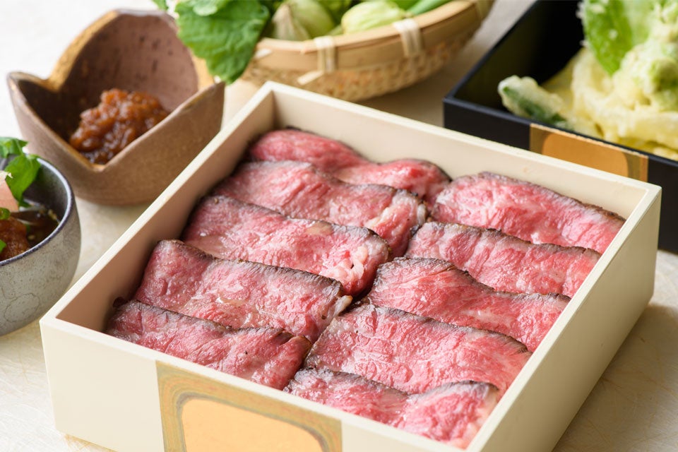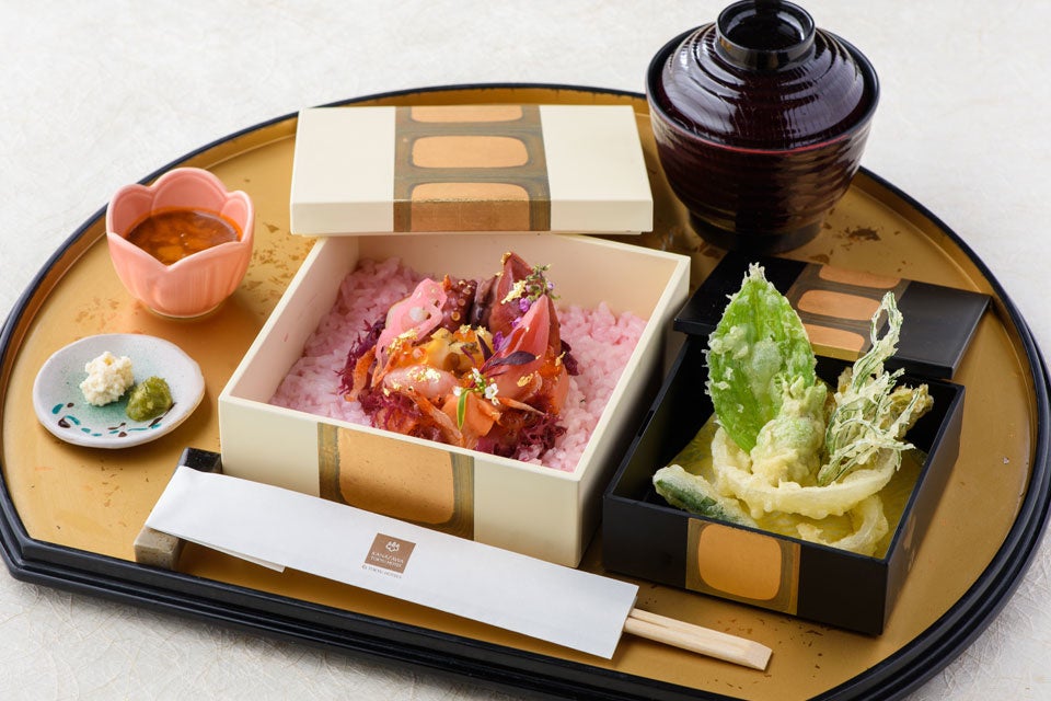 この春は「古代箔」と呼ばれる金箔をあしらったお重に入れた2種類のメニューもご用意いたします。「能登牛のローストビーフ ~極み重~」は、新玉葱をすりおろしたさっぱりとしたおろしポン酢ソースと新玉葱を甘みが出るまでじっくりと炒めたオニオンチャツネの2種のソースで味の変化をお楽しみください。魚介のマリネと野菜を、洋風の寿司酢で作った酢飯にのせた色鮮やかで豪華な「洋風シーフードちらし ~桃色ファンタジー~」は、多彩な食感と風味を味わえます。どちらのメニューも季節の春野菜の天ぷら、加賀味噌の味噌汁がついており、お得な内容です。