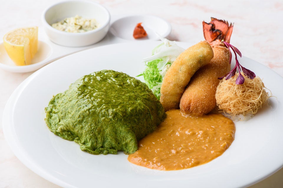 レストラン「マレ・ドール」では、地元の食材を積極的に使用し、食を通して石川の魅力を発信しています。一番人気の商品「ニューバーグライス」を金沢名物ハントンライス風にアレンジした「ニューヴェールライス ~輪島ふぐとオマール海老 ふわふわ卵の舞台での競演~」は小松菜入りの鮮やかな緑色のふんわり卵が特徴です。ニューバーグライスとハントンライス、フランス語で緑を意味する“ヴェール”をかけて「ニューヴェールライス」と名付けました。もっちりした肉質の輪島ふぐとオマール海老のフライ、パリパリの生地で白子を包んだカダイフ巻きを添えました。甲殻類の旨味が詰まった濃厚なニューバーグソースとレモンを効かせたタルタルソースでご提供します。
