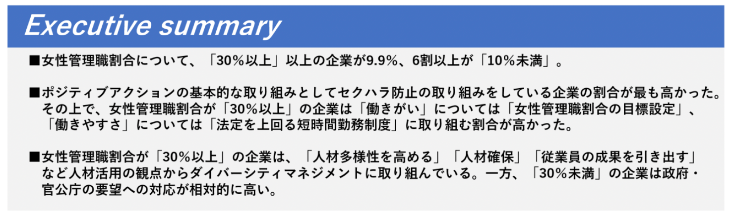一方、「30%未満」の企業は、「法律の施行といった政府・官公庁の要望への対応」を目的にしている企業の割合も低くはありません。管理職や経営陣に十分に女性がいない状況は、ポテンシャルの損失、イノベーションの機会の逸失、そして組織の総合的な効果性に影響を及ぼす可能性があります。単に、「政府・官公庁が要請しているからやる」のではなく、やる意義を企業が捉えて推進していくことが欠かせないでしょう。