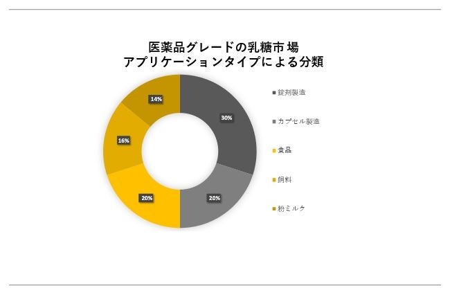 製品タイプに基づいて、非晶性乳糖、および噴霧乾燥乳糖のセグメンテーションは、予測期間に一貫した速度で成長すると推定されています。噴霧乾燥乳糖セグメントの成長は、製薬業界における乾燥粉末吸入器の需要の高まりに根ざしています。乾燥粉末吸入器セクターは、呼吸用吸入器業界全体の約 48% を占めています。噴霧乾燥ラクトースは、流動性と圧縮性を改善します。これにより、他の賦形剤よりも、薬物投与におけるラクトースベースの賦形剤として最大の効率が得られます。さらに、非晶質ラクトースは、製薬部門で同様の有用性を提供しており、ラクトースを含まない製品の需要が高まっているため、成長マトリックスを中心にピボットすると推定されています。