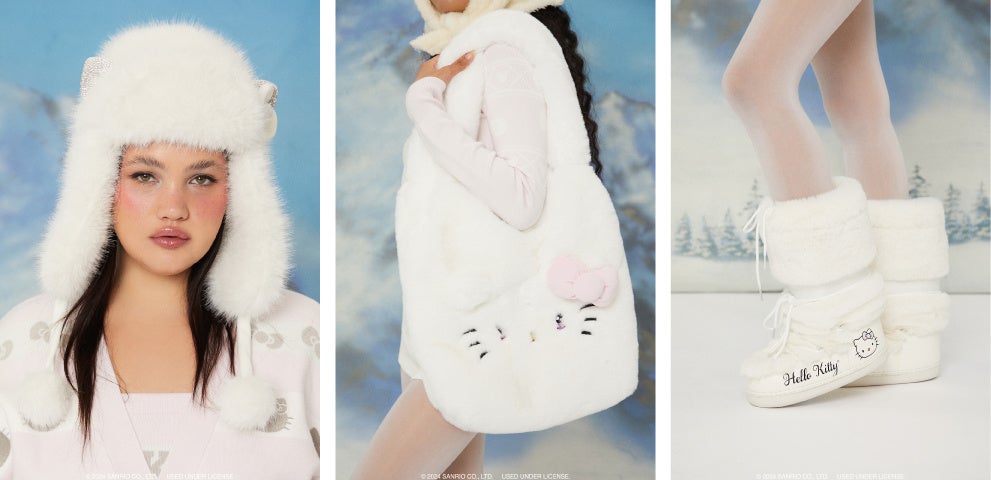 サンリオキャラクターのシナモロール、マイメロディ、キティがデザインされた、ホワイト・ピンク・グリーンのパステルカラーを基調としたホリデーシーズンにぴったりなカラーリングのアイテムが登場します。毎度大好評のキャラクタープリントTシャツやキュートなデザインのキティモチーフカーディガン、これからの季節にピッタリなファー素材のフライトキャップ,トートバッグ,ブーツなどサンリオ好きの方はもちろんファッション好きの方にもお楽しみいただけるスペシャルなコレクションアイテムです。