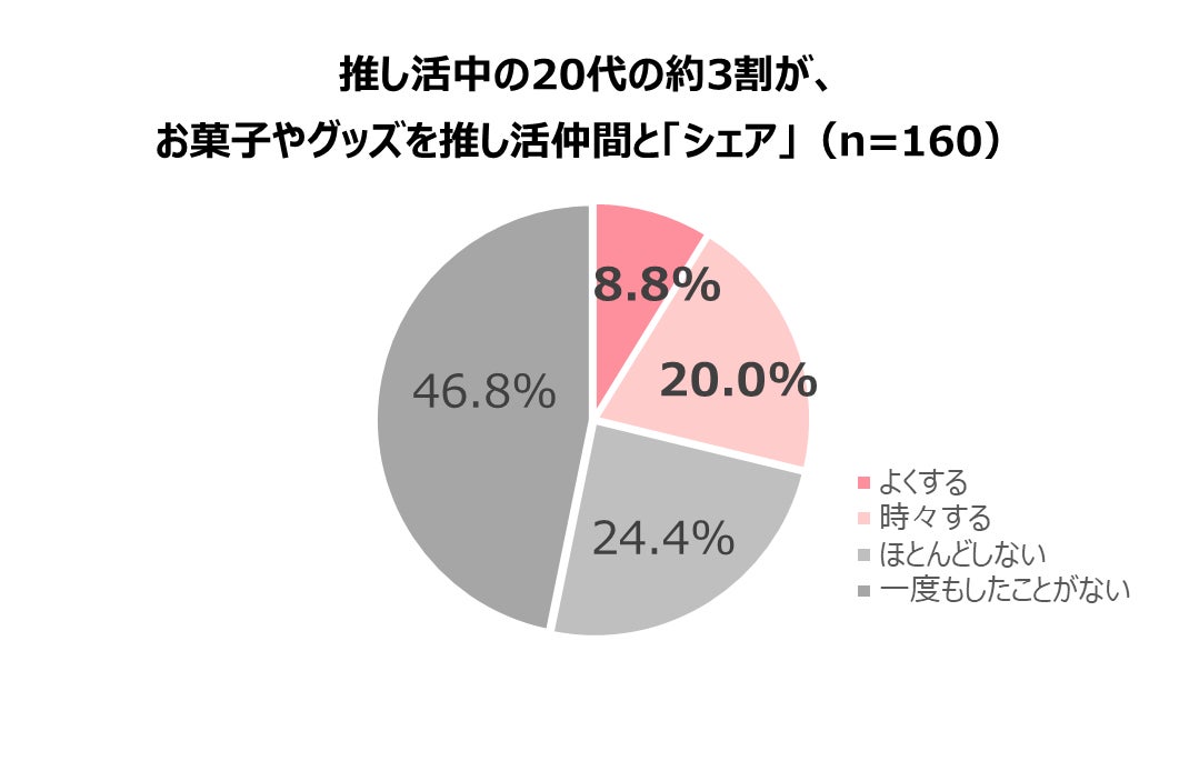 ロッテが今年2月に行った「推し活に関する調査」では、推し活中の20代の約3割が、お菓子やグッズ等を推し活仲間と「シェア」しており、特に若い世代で「シェア」が活発に行われていることがわかりました。また、推し活でお菓子をシェアをすることで「コミュニケーションがとりやすくなる」「仲良くなれる」と感じている人が多く、実際に「バレンタインデーに推しの写真を貼り付けたチョコレートを配った」などのエピソードが寄せられました。