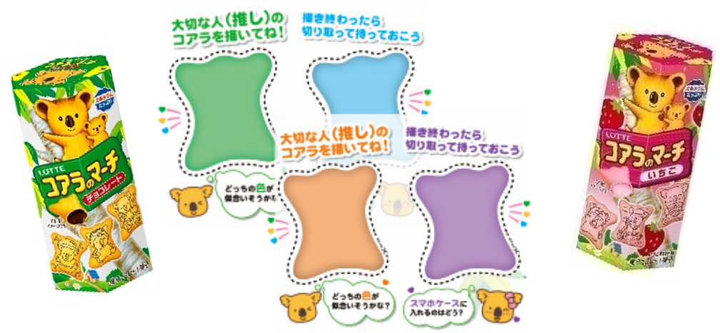 商品パッケージの側面にある絵柄が描いていないビスケットのフレームに絵柄を描いて推しコアラを作成。