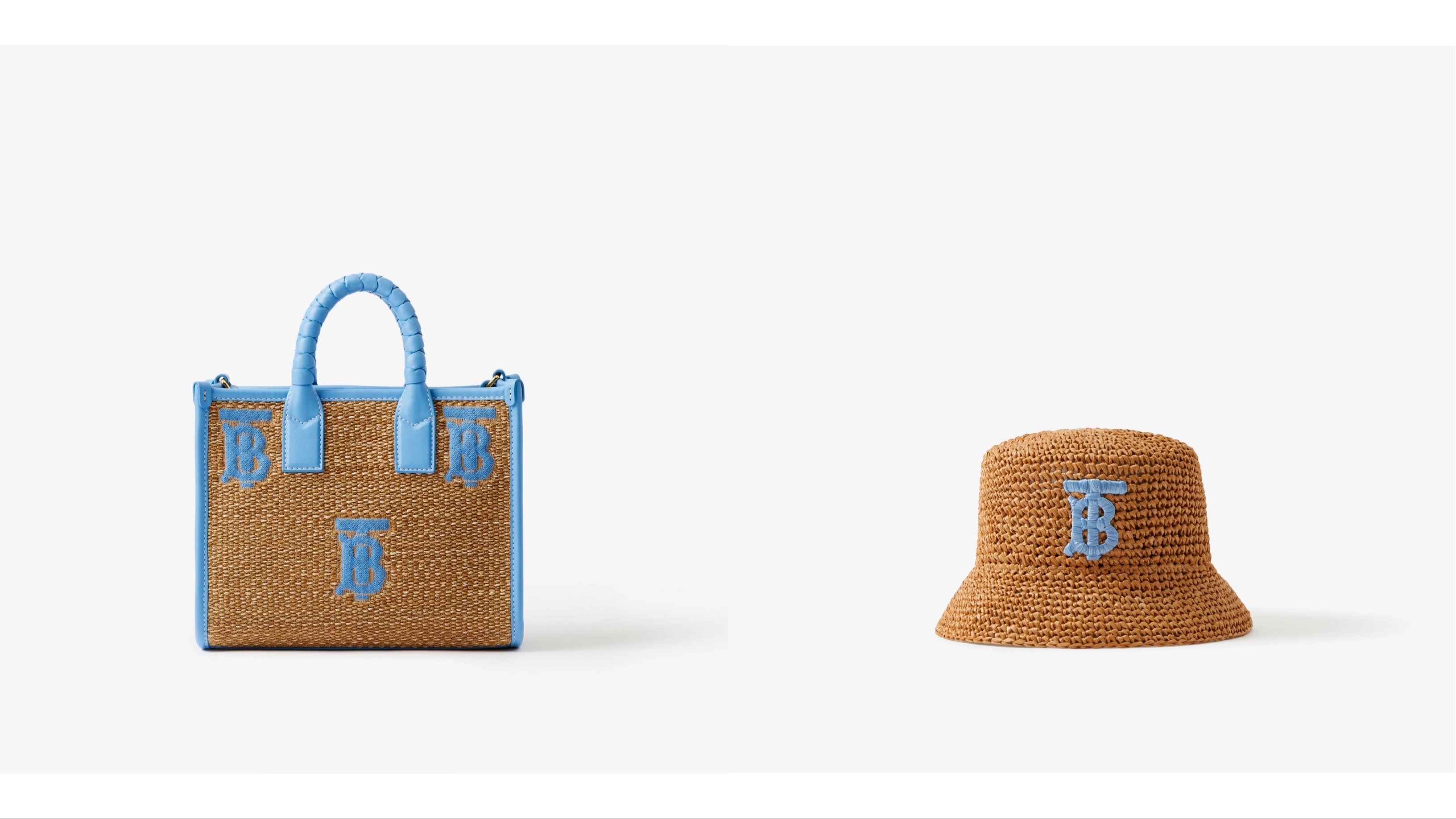 右)モノグラムモチーフ ラフィアエフェクト バケットハット:手作業でクロシェ編みにしたラフィア風のバケットハット。コントラストの効いたトーマス・バーバリー モノグラムがアクセントに。