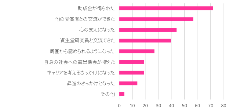 一方、本グラントを受賞して良かったことについては、「助成金が得られた」、「優秀な他の受賞者との交流が次の発想につながった」、「受賞そのものが心の支えになった」、「資生堂の研究員と交流がもてた」、「周囲から認められるようになった」などが挙げられました(図2)。これらの結果から、助成金という有形の支援に加え、ネットワーク形成をはじめとする無形の支援もまた、厳しい環境下にある女性研究者には有意義であると考えられます。