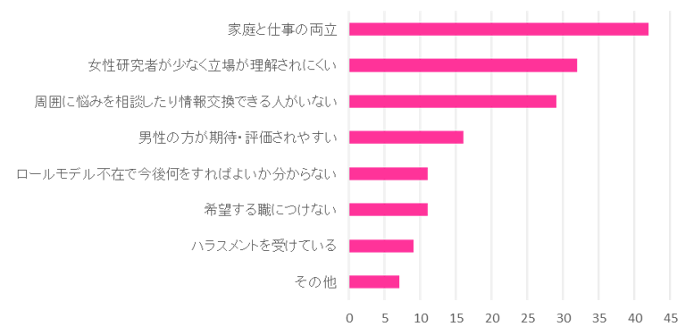 女性研究者の現状について、過去の受賞者を対象にアンケート調査を実施した※2ところ、8割以上の研究者が「女性ゆえに困っていることがある」と回答しました。その理由として最も多く挙げられたのは、「家庭と仕事の両立が困難である」、そして「女性研究者が少なく立場が理解されにくい」、「周囲に相談・情報交換できる人がいない」と続きました(図1)。 日本社会に根付く性別役割分担意識※3を背景とした家庭と仕事の両立の困難、孤立しやすい、キャリア形成に不安といった悩みを抱えている女性研究者の実態が浮彫りになりました。