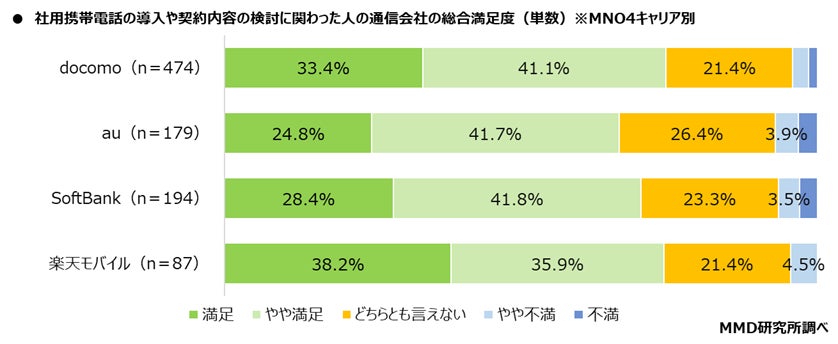 MMD研究所による調査では、総合満足度で楽天モバイルは2位となり、「満足」と回答した割合が38.2%と最も高く、「不満」と回答した割合は最も低くなっています。