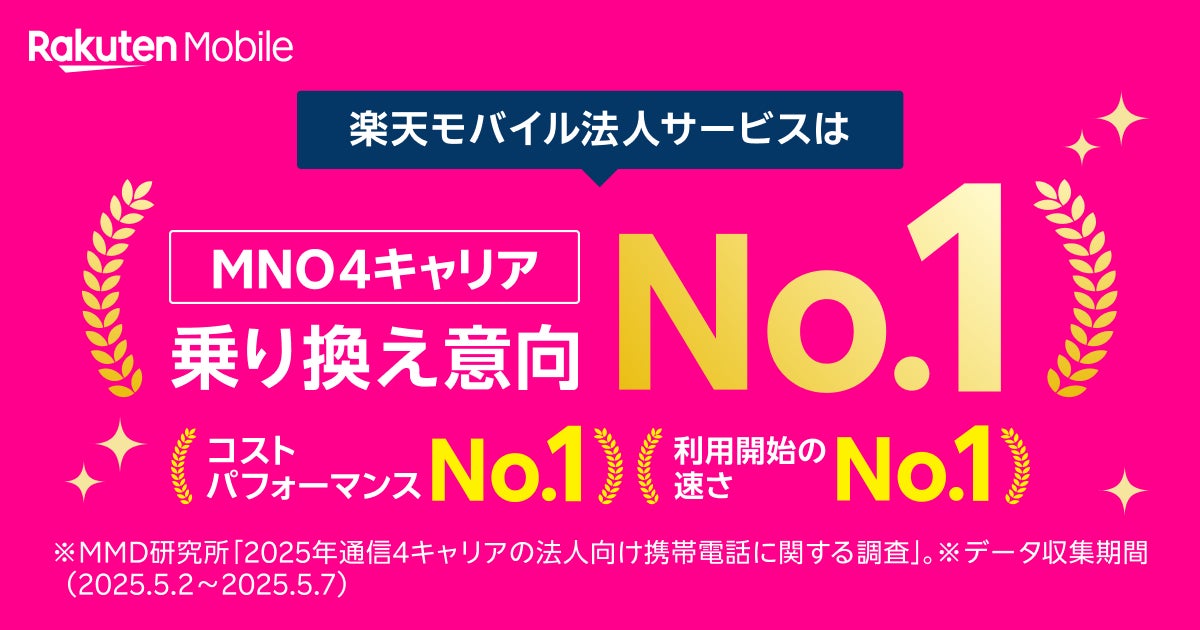 楽天モバイル株式会社(以下 「楽天モバイル」)は、MMD研究所が実施した「2025年通信4キャリアの法人向け携帯電話に関する調査」において、「乗り換え検討先」、項目別満足度「コストパフォーマンス」、および「利用開始までの速さ」で1位を獲得しました(注1)。