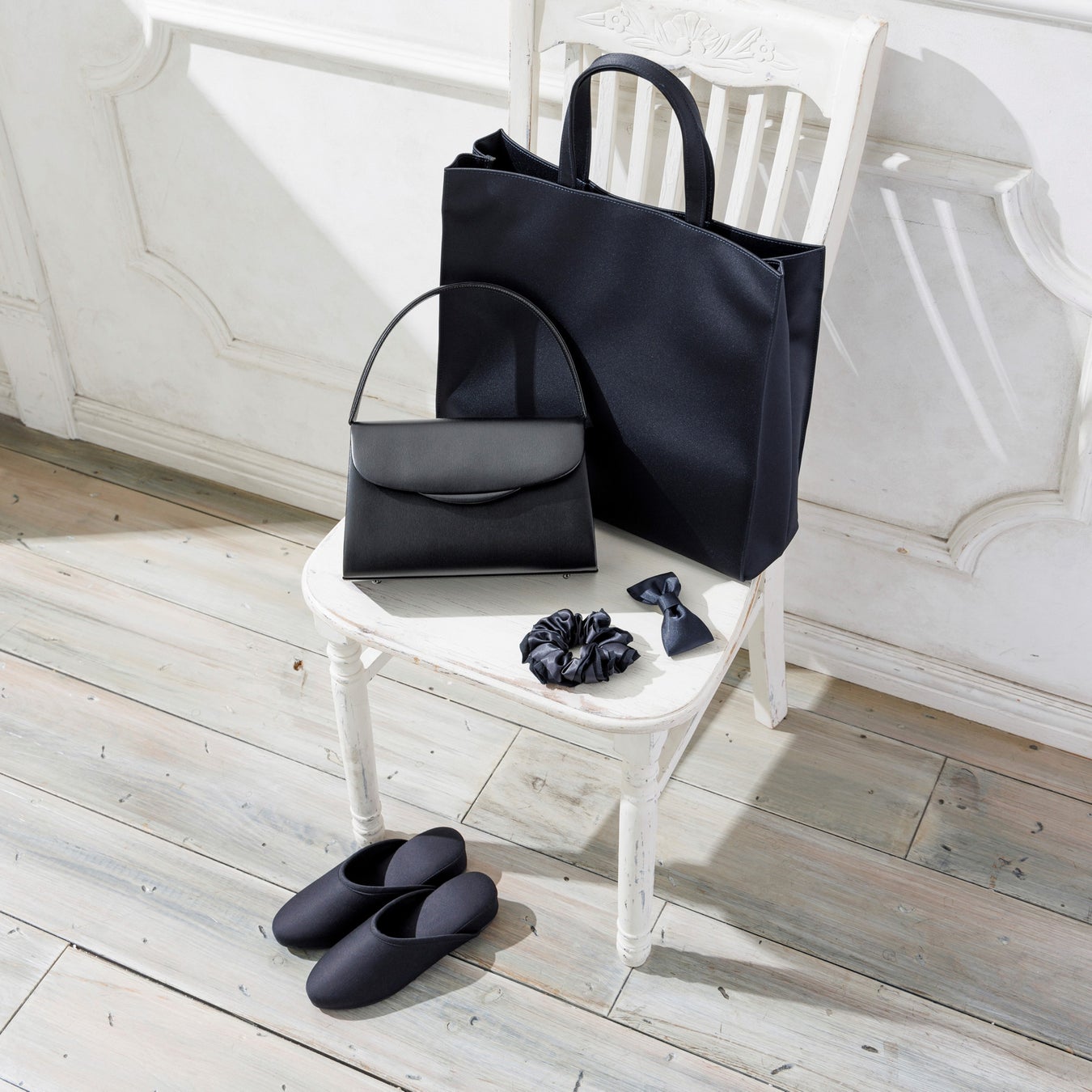 <プチソワール>バッグ 61,600円、トート22,000円、シュシュ3,300円、バレッタ3,300円、スリッパ 5,280円 ※メンズサイズのご用意もございます。