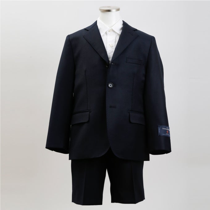 シルクのような柔らかさとふわりとした軽さが特徴の「ゼニア」社の生地を用いたスーツです。サスペンダー付のため、お体が小さいお子さまも安心して着こなしていただけます。