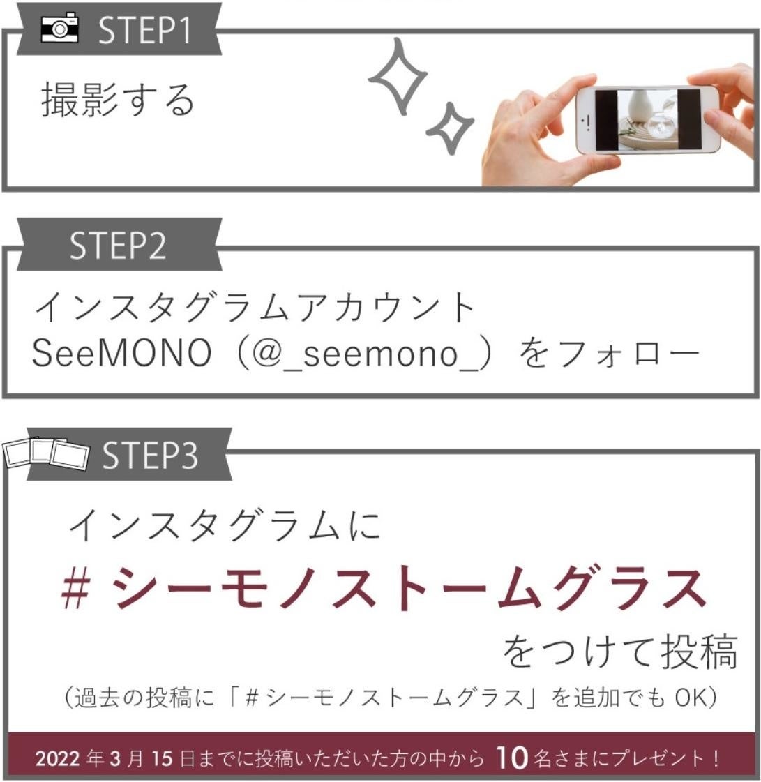 STEP3・・・Instagramに「#シーモノストームグラス」をつけて画像を投稿(もしくは過去の投稿に「#シーモノストームグラス」を追加)。