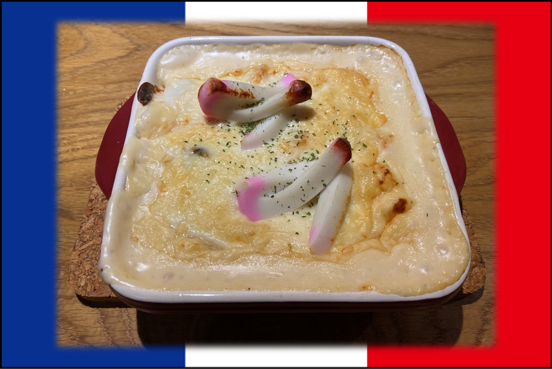 ・メニュー名:「舞鶴かまぼこと海老のグラタン」