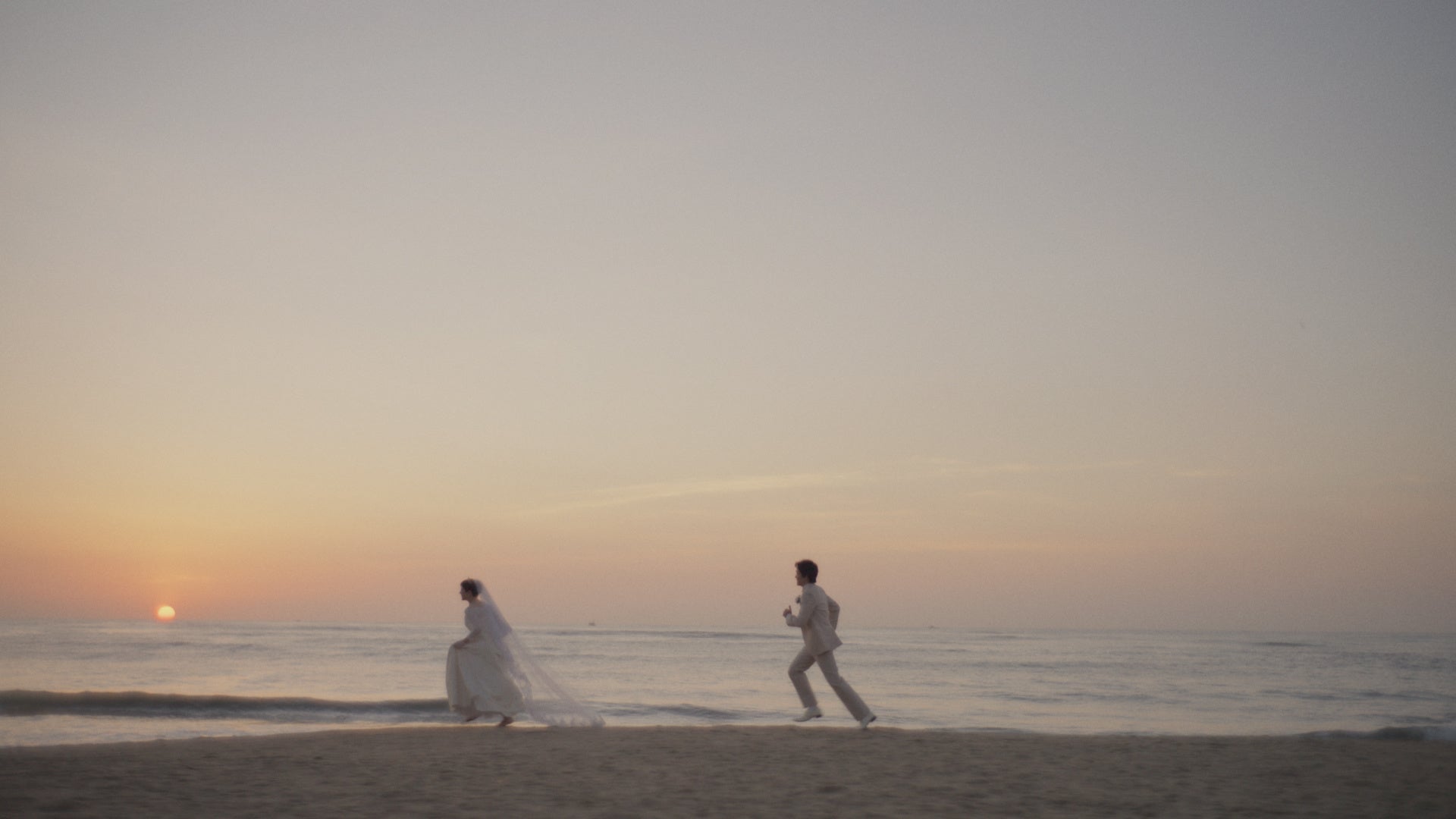 「とにかくそういうことなの」という一言で、教会を飛び出す2人。美しい砂浜をウエディングドレスとタキシードで走る2人。