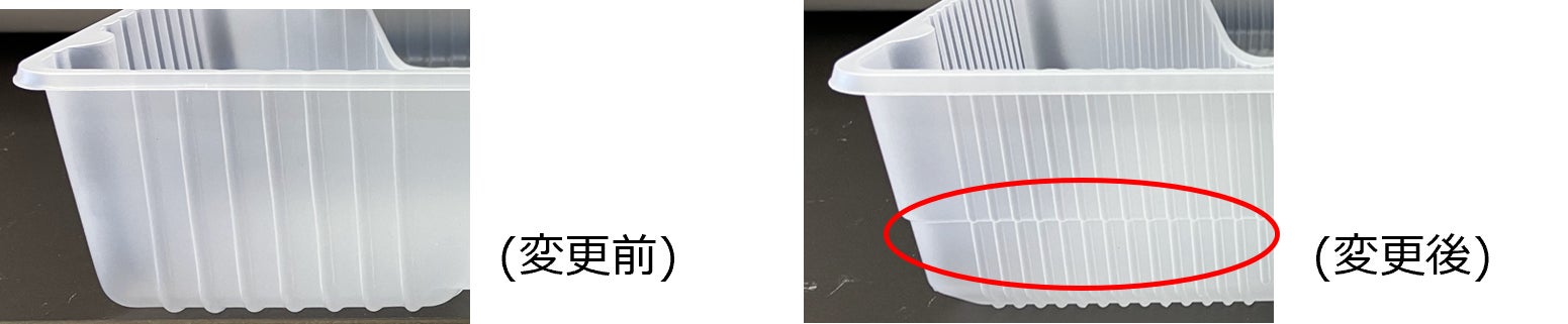 2020年から本取り組みを段階的に進め、トレーの厚みを0.35㎜から0.31㎜に変更し、プラスチック使用量を約11%の削減(注2)を実現しました。今回の変更では、耐衝撃強度を保つため、トレー側面の縦線(リブ)の本数を増やし、横方向の段差をあらたに追加しています。