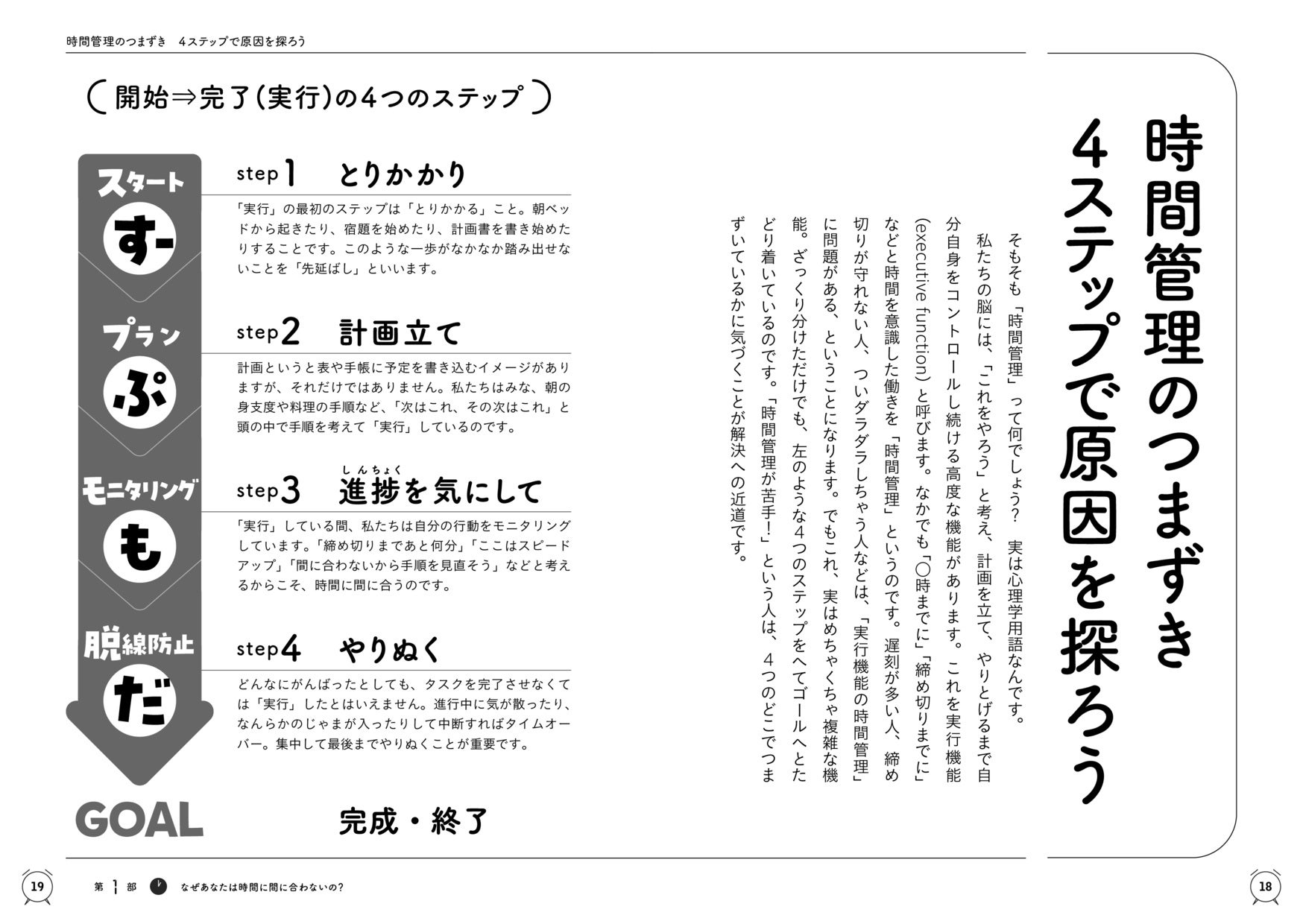 「時間管理」は実はめちゃくちゃ複雑な機能。ざっくりとわけただけでも、開始から完了まで4つのステップがあります。ステップ1は「スタート・とりかかり」、ステップ2は「プラン・計画立て」ステップ3は「モニタリング・進捗を気にする」ステップ4は「脱線防止・やりぬく」頭文字をとって、合言葉は「すーぷもだ」、これを覚えておきましょう!いつも締め切りが守れない人は、この4つのステップのどこかにつまずきがあるというのです。