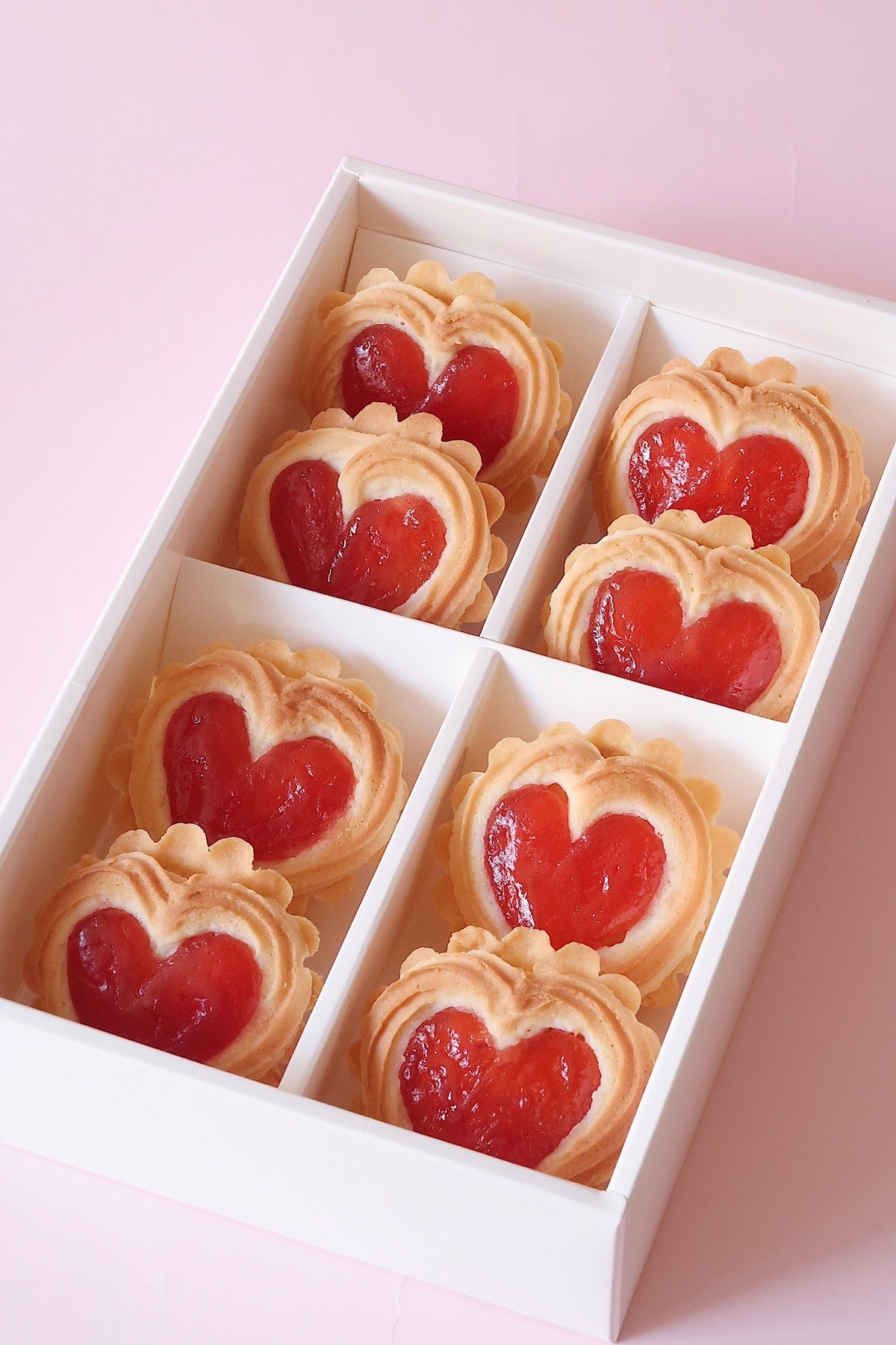 いちごジャムをハート形に絞って焼き上げたドライケーキです。