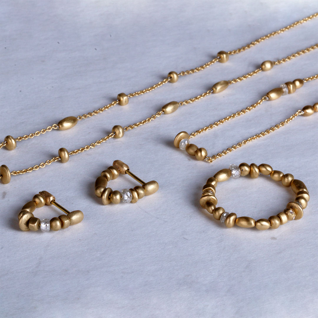 手掘りのダイヤモンドビーズとひとつずつ削り出した18金のビーズは、全てカタチが違う一点もの。ショップのオープンに合わせて、伊勢丹新宿店で先行販売いたします。