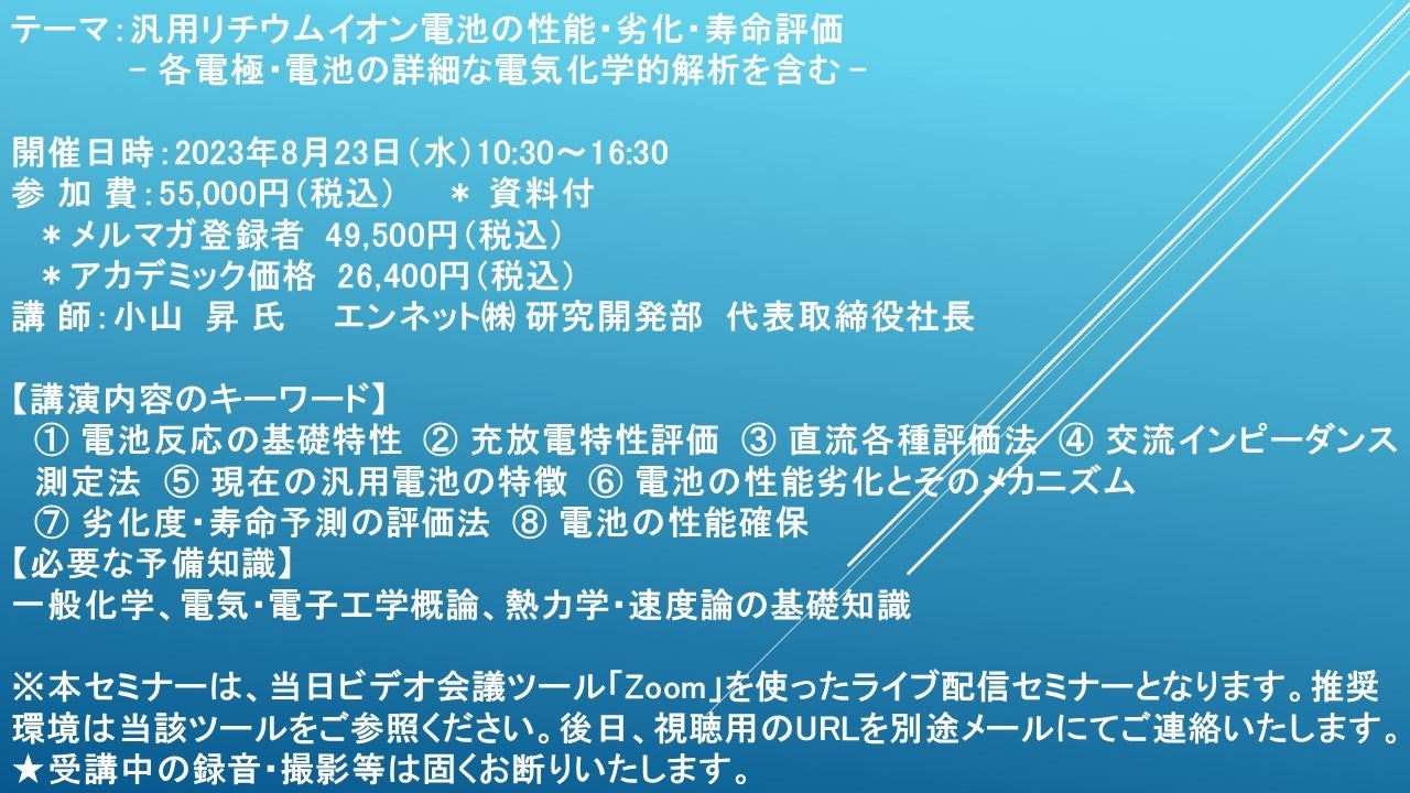 【ライブ配信セミナー】汎用リチウムイオン電池の性能・劣化・寿命評価– 各電極・電池の詳細な電気化学的解析を含む – 8月23日(水)開催 主催:(株)シーエムシー・リサーチ
