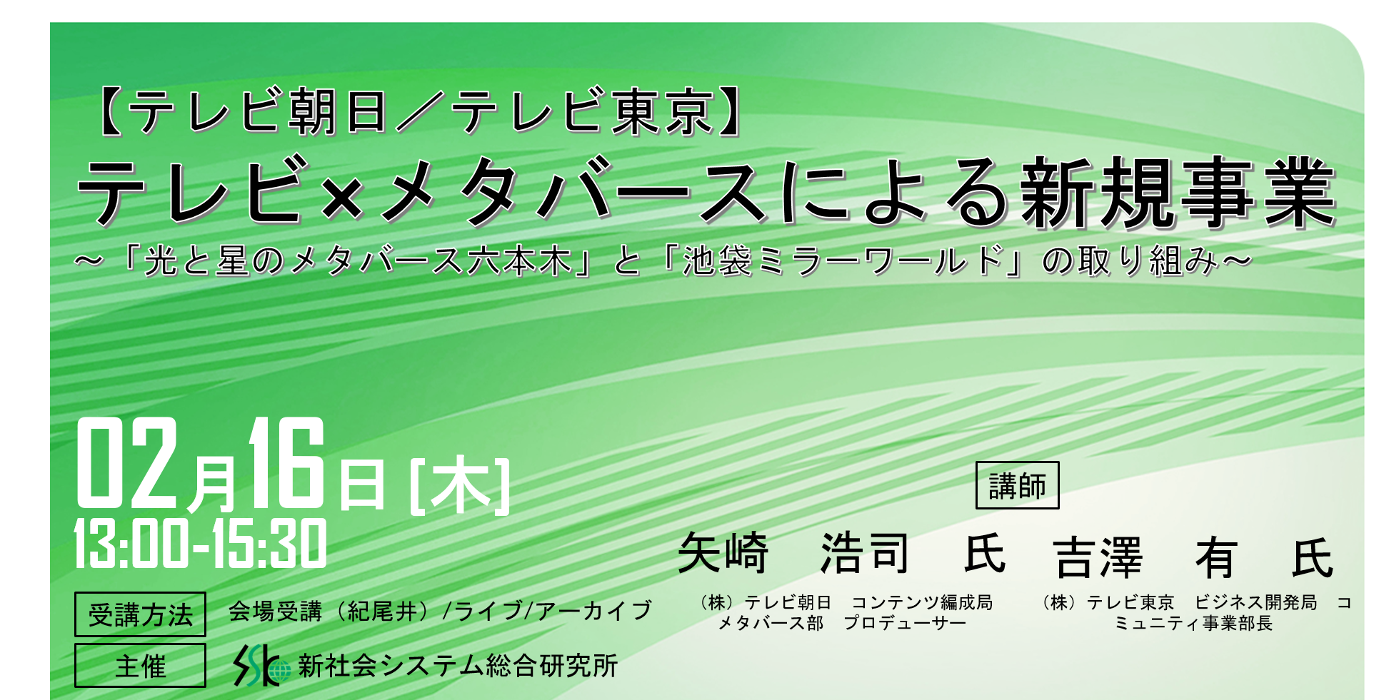 「テレビ×メタバースによる新規事業」と題して(株)テレビ朝日 矢崎 浩司氏/(株)テレビ東京 吉澤 有氏のセミナーを2月16日(木)に開催!!
