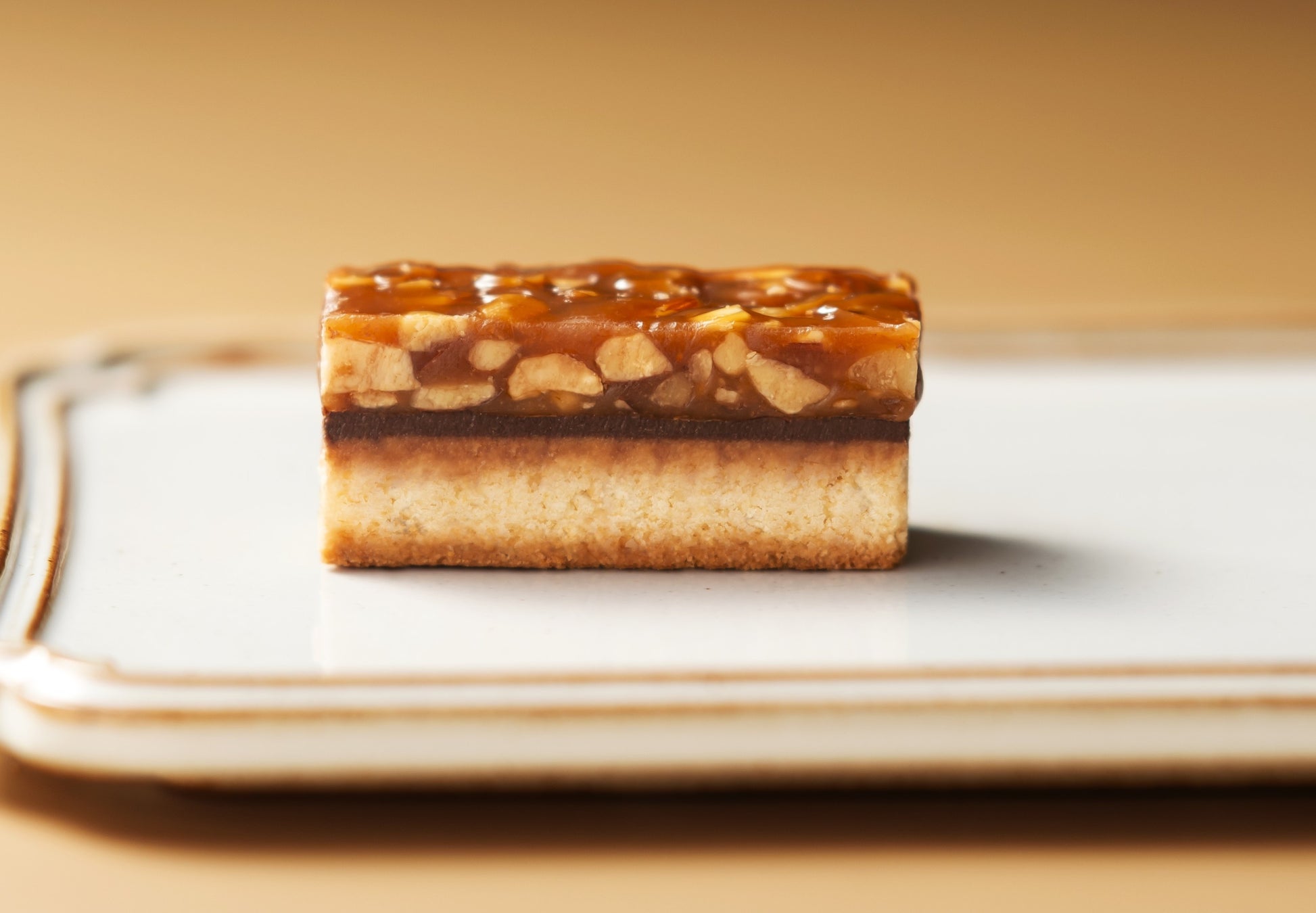 ショートブレッド、チョコレートクリーム、キャラメルの三層が織りなす極上のひととき。