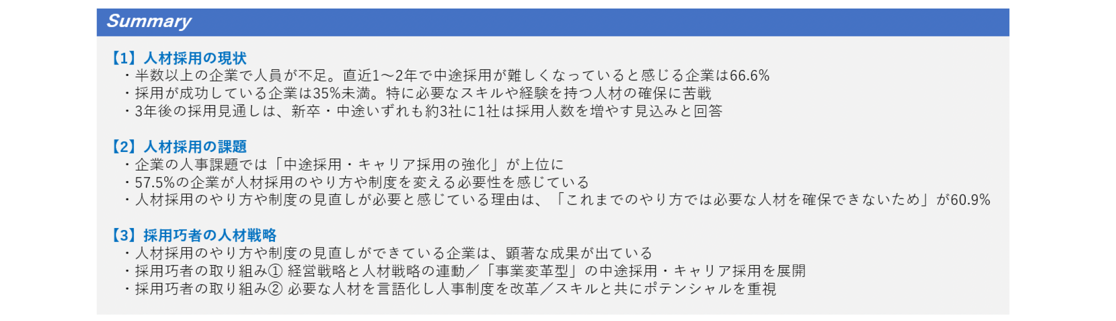 本リリースは主に中途採用・キャリア採用についてまとめています。構造的な人手不足の中、企業の人材採用はますます難易度が高いテーマになっています。実際に、66.6%の企業が以前に比べて直近1~2年の中途採用が難しくなっていると感じており、数ある人事課題のうち「中途採用・キャリア採用の強化」を課題に感じている割合が、全25項目中4番目に高いという調査結果が示されました。人手不足の対応としては、採用だけで全ての側面が解決するわけではありません。しかし、このような状況の中でも、従来の採用のやり方や制度を見直して成果を出している「採用巧者」の企業の存在が調査から見えてきました。