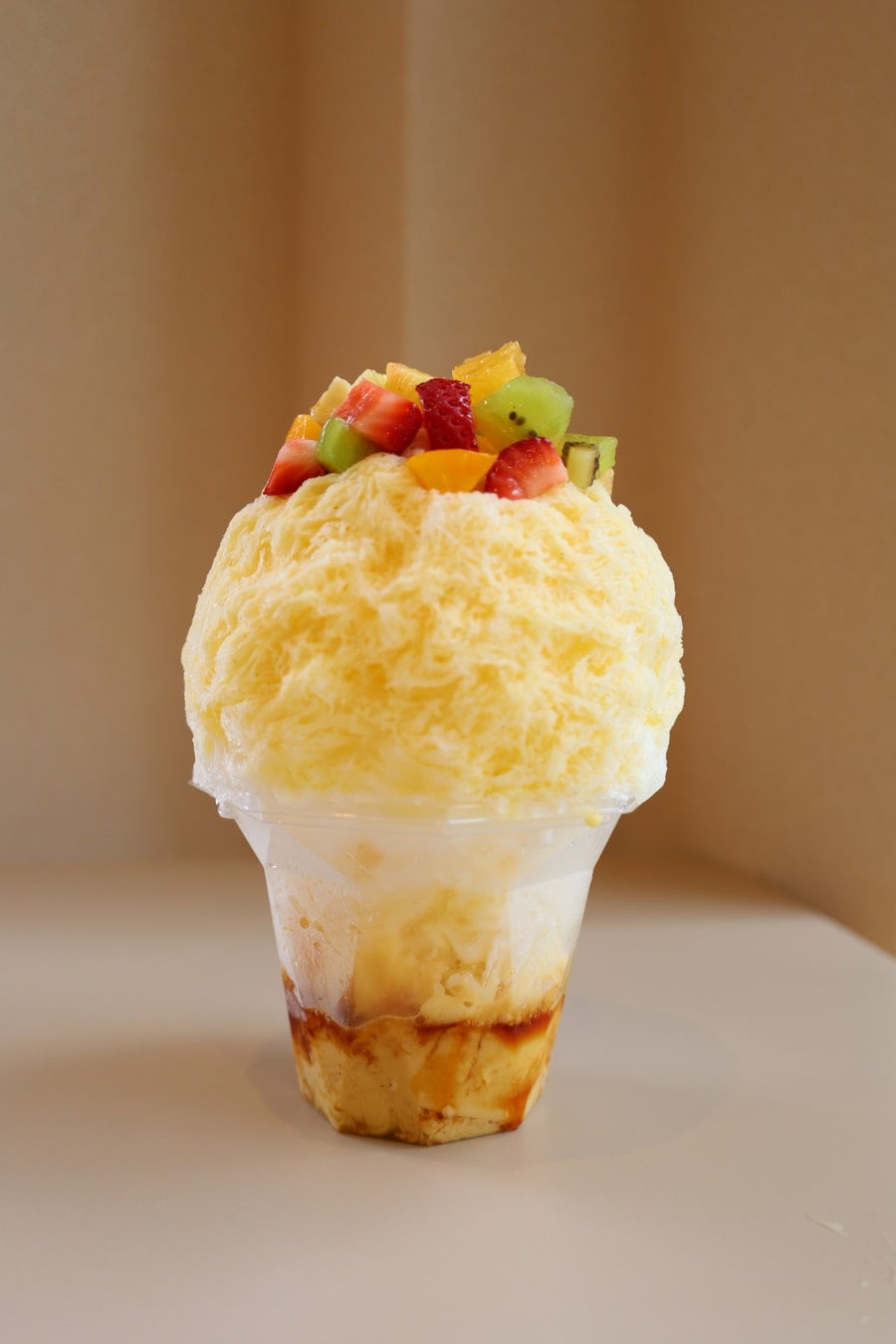 地元の季節のフルーツを活かしたかき氷が人気のスイーツのお店。カスタード風味のかき氷の中に純生ホイップクリームと自家製プリンを入れたっぷりの旬の果物を乗せました。