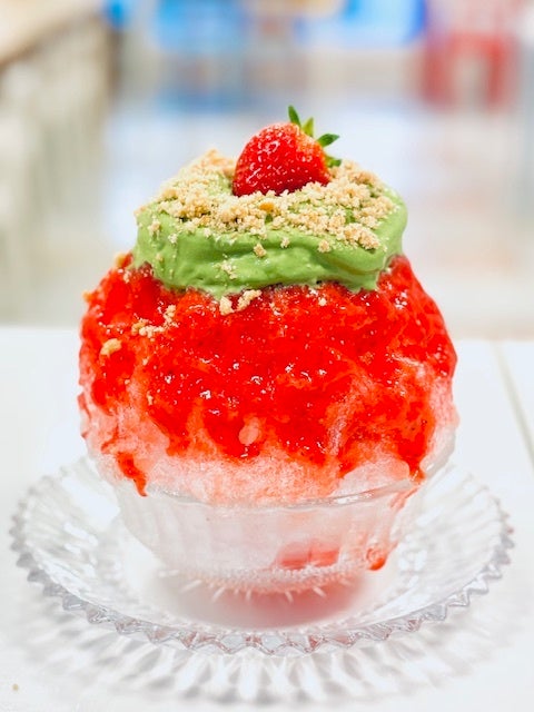 天然氷を使用したふわふわの食感、夏いちごと人気のピスタチオとのコラボの人気かき氷。
