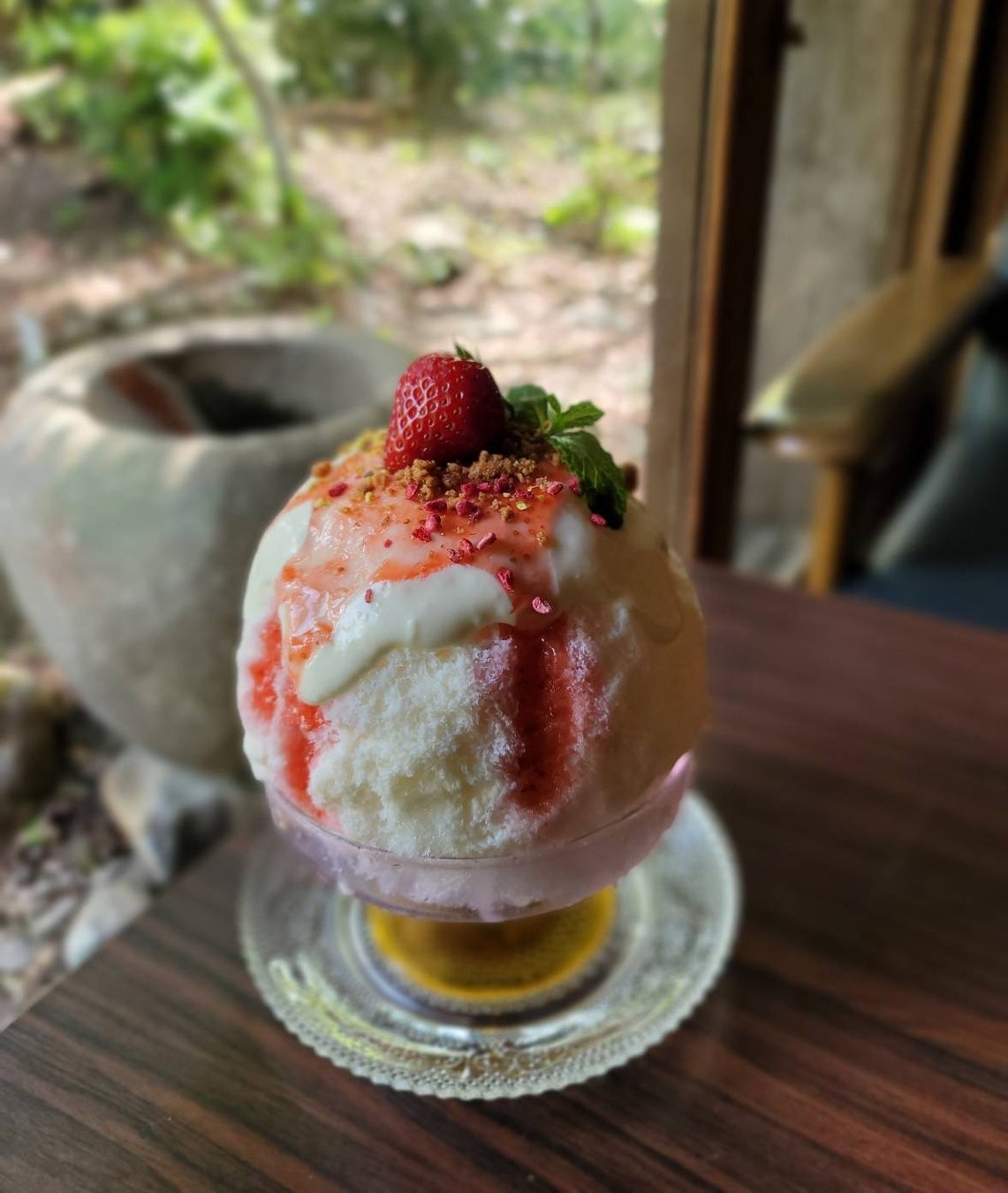兵庫県三田市のいちご100%使用のいちごシロップ、中にはいちごジャムを贅沢に使用。 濃厚なクリームチーズソースをかけた苺レアチーズケーキを表現したかき氷。