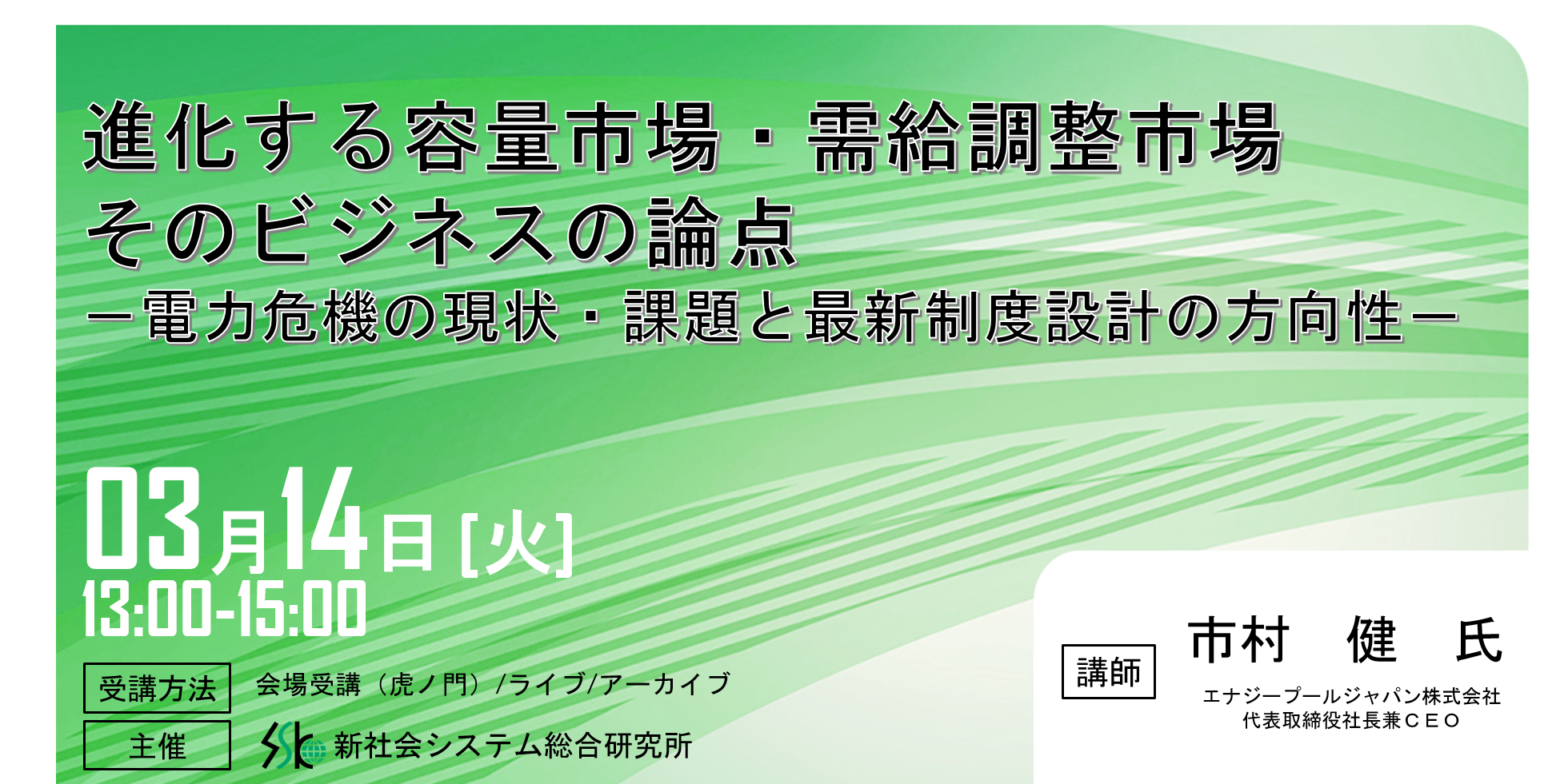 「進化する容量・需給調整市場ビジネス論点」と題してエナジープールジャパン株式会社 代表取締役社長兼CEO 市村 健氏のセミナーを3月14日(火)に開催!!