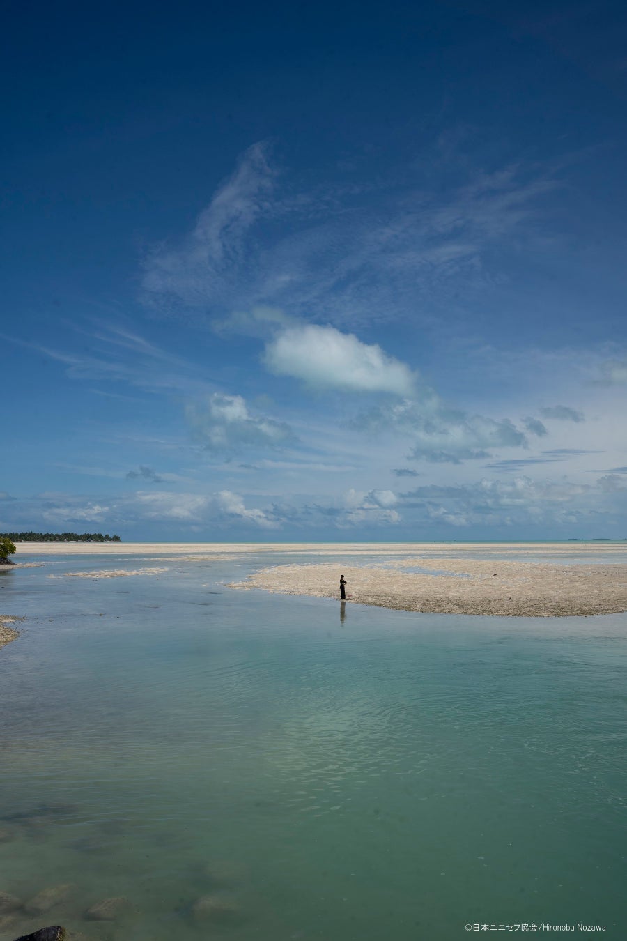 太平洋に浮かぶ33の環礁でできた美しい島国、キリバス。人々は満ちては引く海とともに穏やかに生きてきました。しかし、今キリバスは海面上昇による海岸浸食をはじめ、暴風雨や干ばつなどの異常気象、高潮など気候変動の影響による深刻な問題に直面しています。2024年5月末~6月初旬にキリバスを視察したユニセフ・アジア親善大使のアグネス・チャンさんに同行した写真家・野澤亘伸氏の作品を通して、キリバスと子どもたちの現状を紹介する本企画展は、先進国の活動によって気候危機の最前線に立たされている人々の暮らしをさまざまな側面から伝えます。