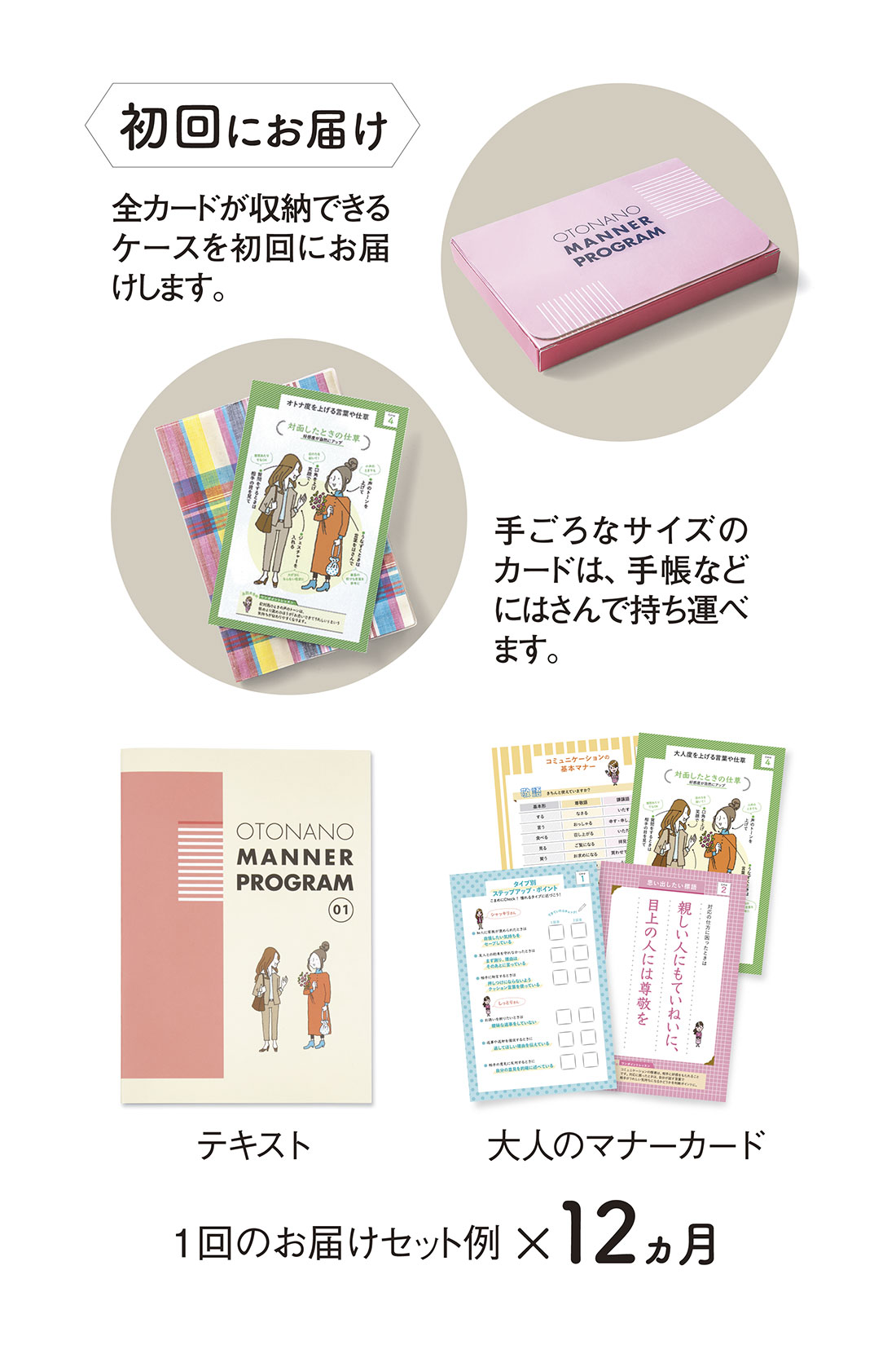 ・セット内容 / テキスト1冊(B5判 20ページ)、大人のマナーカード 4枚、カードボックス(縦約12cm、横約18cm、高さ約2cm 初回のみお届け)