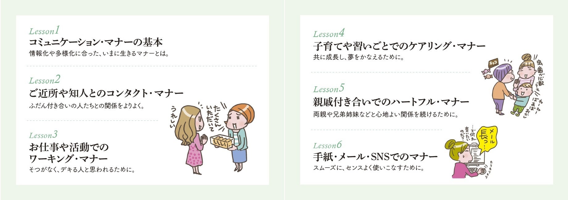 前半は、子育てや仕事、近所の人とのお付き合いなど、日常に欠かせない身近なコミュニケーションに関するマナーから始めていきます。