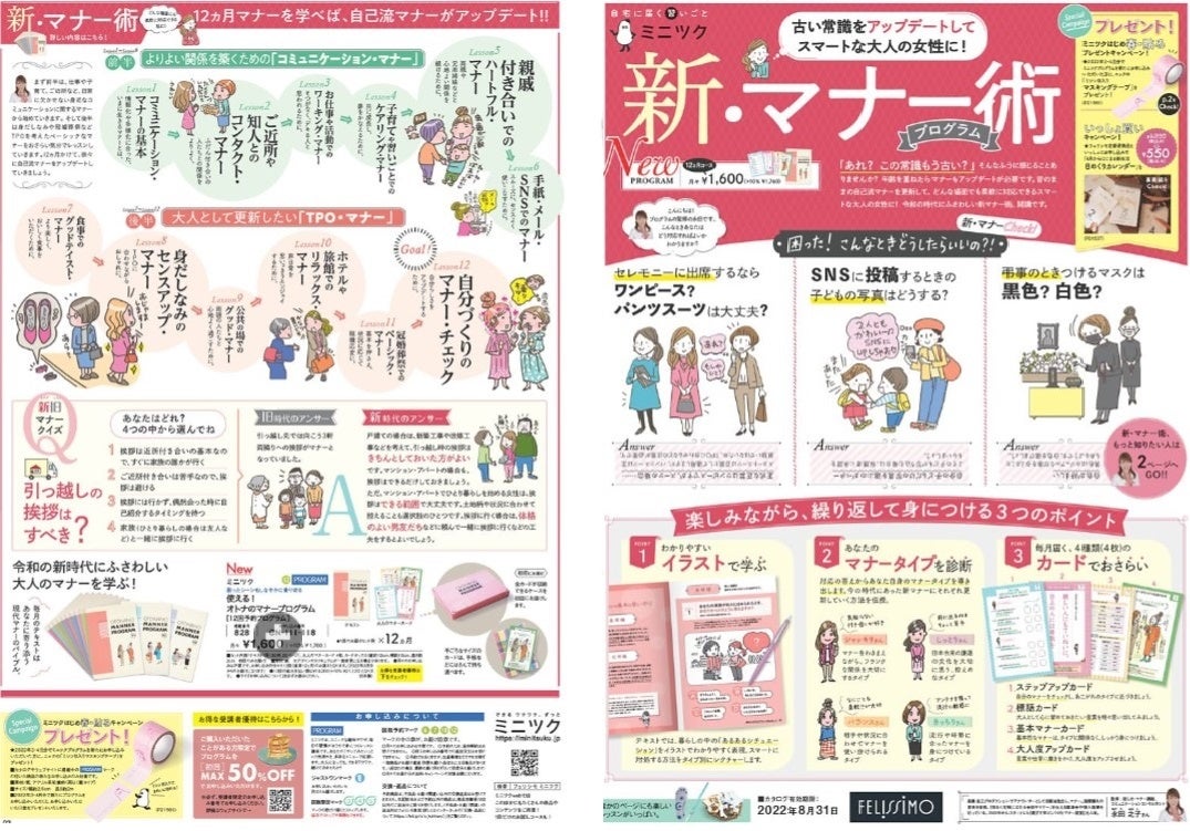 フェリシモが展開する、おうちレッスン「ミニツク®」は、新プログラム「困ったシーンもしなやかに乗り切る 使える! オトナのマナープログラム」を1月21日に発表、ウェブ販売を行っています。人と話すときのコミュニケーションからSNS利用時のマナーまで、毎月、わかりやすいイラストつきのテキストで学び、いつでも見返すことができるカードでおさらいできます。新しい時代のマナーを身につけて、どんな場面でも対応できるようになる、12ヵ月間毎月届くレッスン講座です。思いやりのあるスマートな大人の女性になれる、オトナのマナープログラムの詳細は、デジタルカタログや、特設サイトで見られます。
