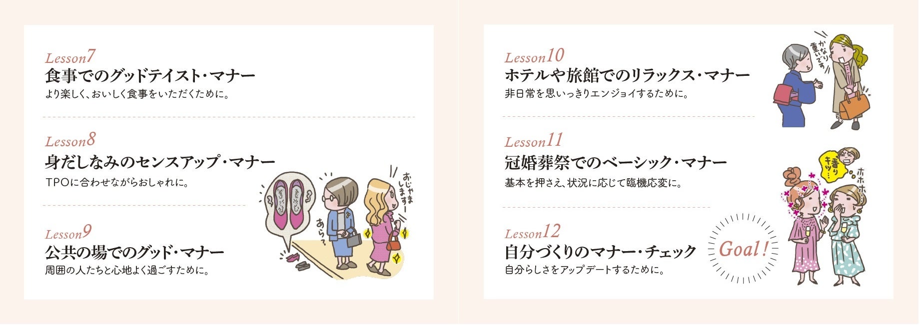 後半は身だしなみや冠婚葬祭など、TPOを考えたベーシックなマナーをおさらい気分で学びます。徐々に自己流マナーをアップデートしていきましょう。