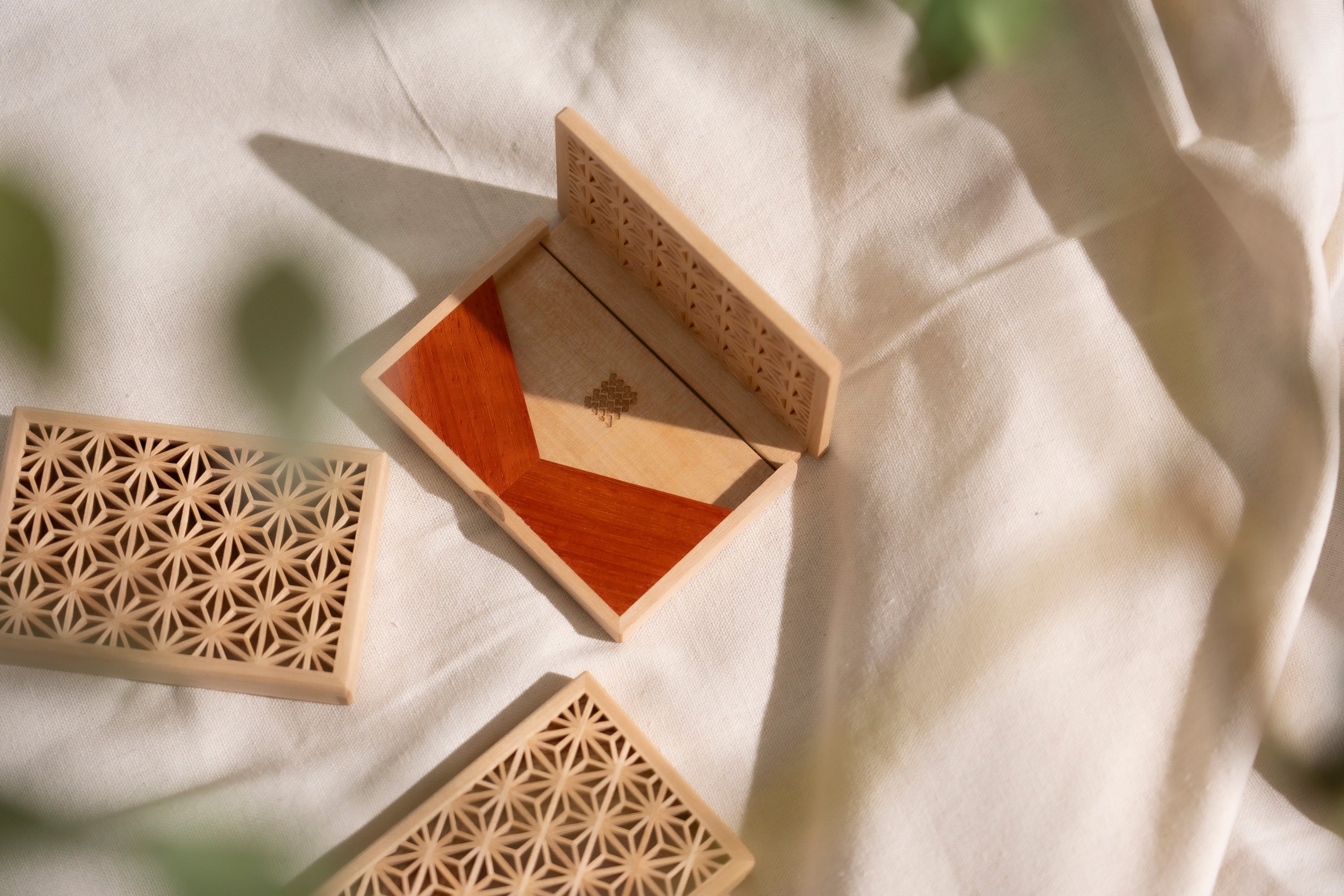 伝統建具に使われる 装飾技術「組子」を現代のライフスタイルに。受け継がれてきた職人技と天然高級木材を使用したカードケースやコースターなどを展開します。