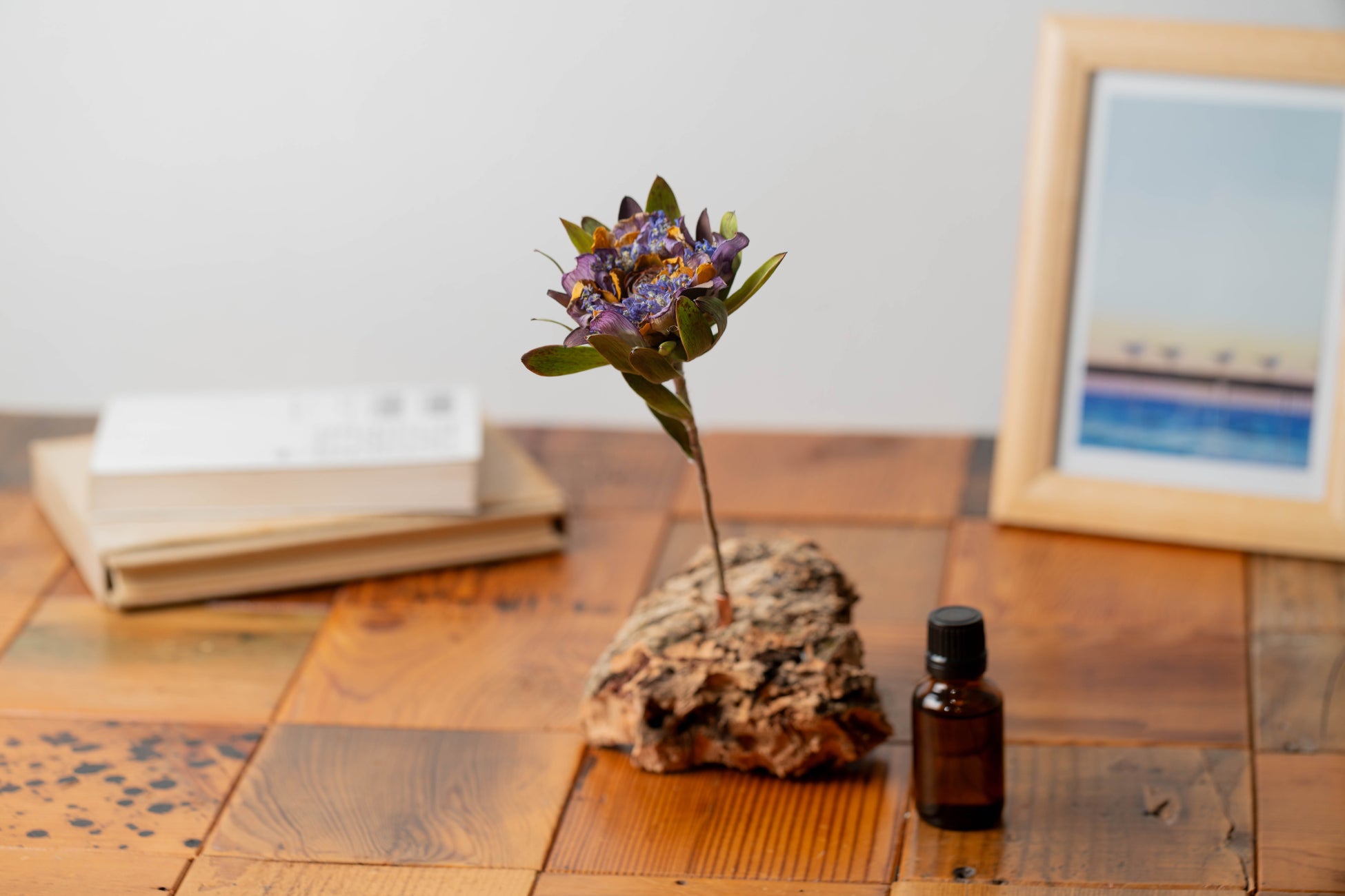 市販花材に加え、花材としての価値から”はぐれて”しまった草花を、ドライフラワーに活用。花弁や葉を再構築し作られたハンドメイドフラワーは、アロマオイルをたらすことで、アロマディフューザーにも。