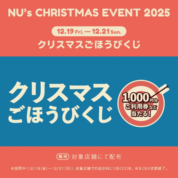 2025年のご愛顧に感謝の気持ちを込めて、ハズレなしのくじ引きを開催!NU茶屋町・NU茶屋町プラスご利用券、飲食店舗サービス券などが当たります◎お買い物すればするほどお得になる、NU茶屋町・NU茶屋町プラスのクリスマスを楽しもう。
