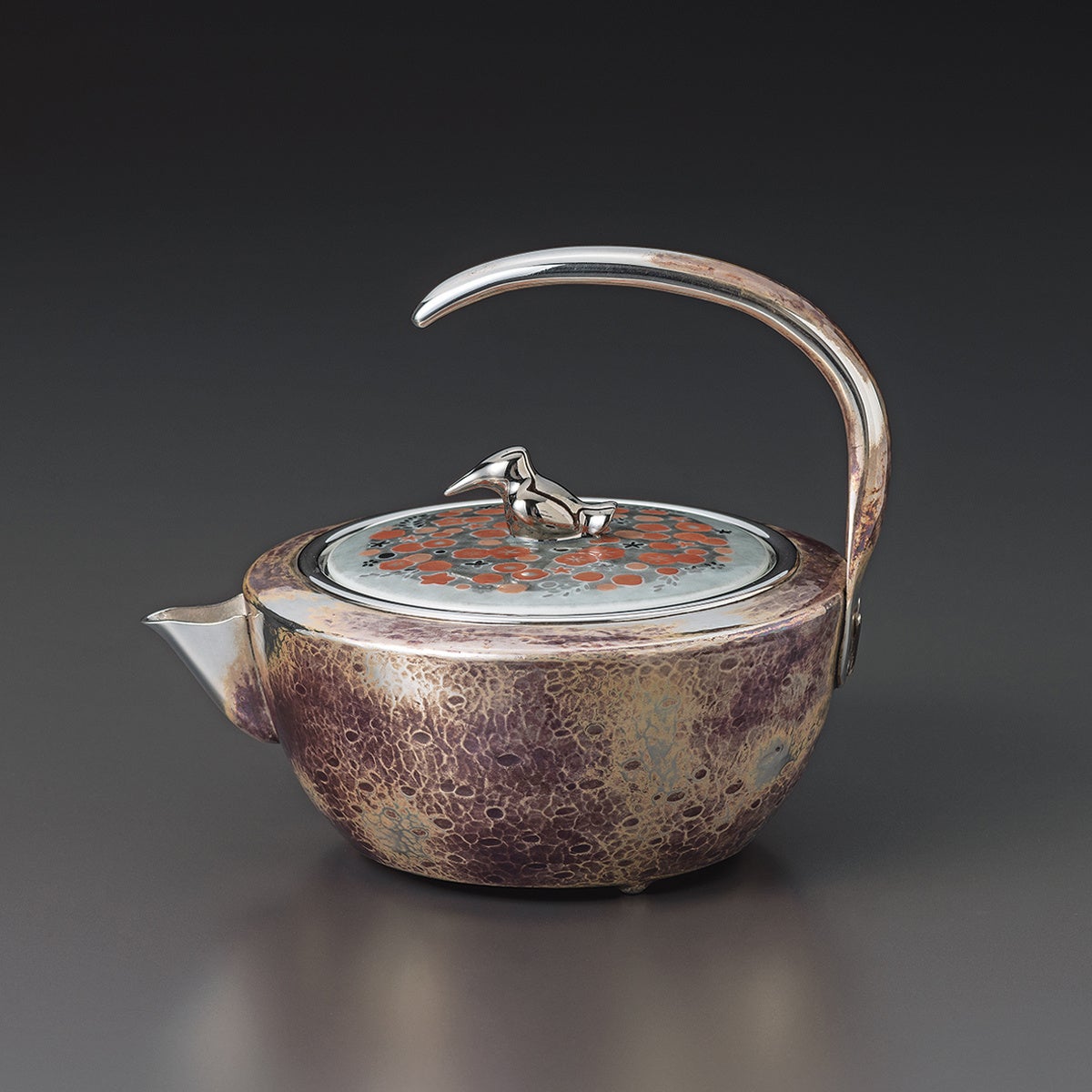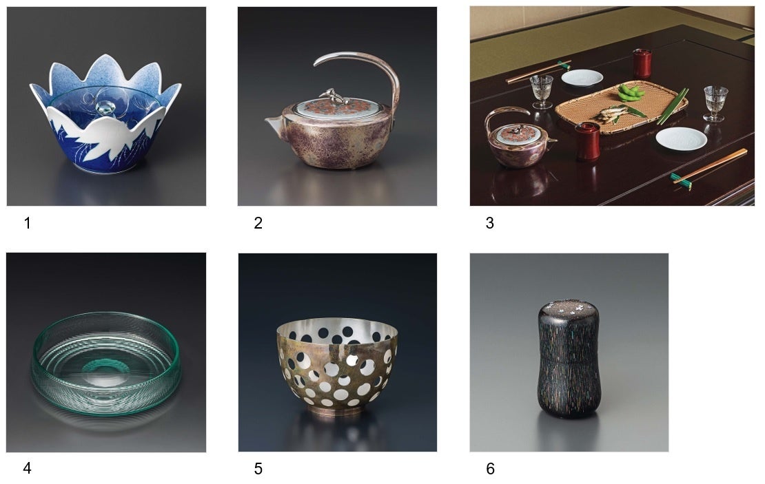 2.三代 𠮷羽與兵衛「南鐐嘴片手酒次」2023年, 十四代 今泉今右衛門「色絵薄墨墨はじき草花文蓋」2023年